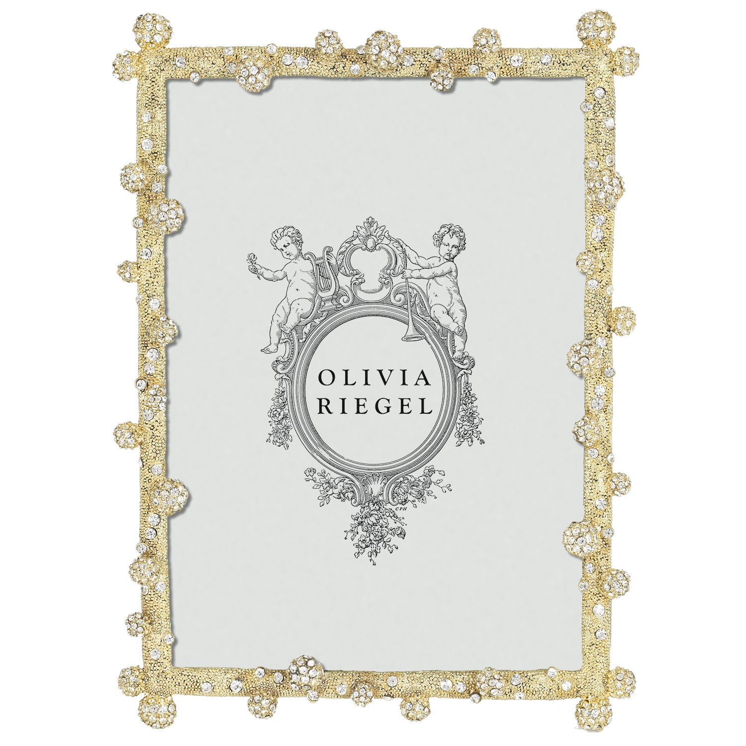 Dozens of hand-set clear European crystal pavé clusters in textured gold tone metal finish. Elegant moiré silk back with easel for vertical or horizontal placement. Beveled glass.