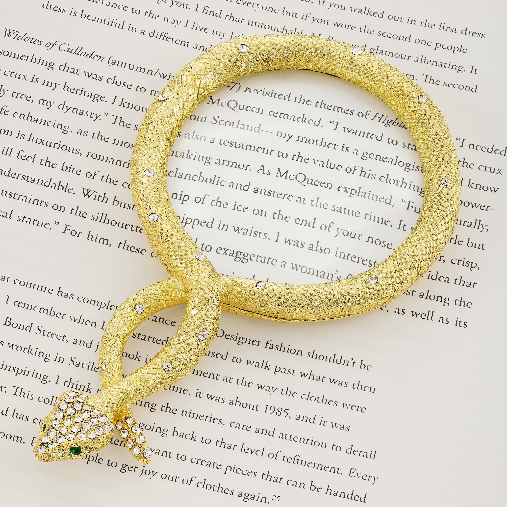 Celebrate the wisdom and mystery of the 2025 year of the snake with this chic gold or silver finished pewter serpent patterned magnifying glass. Encrusted with hand-set clear pavé European crystals and emerald green crystal eyes. 2x magnification. Tarnish resistant. Signature luxury gift box included.
