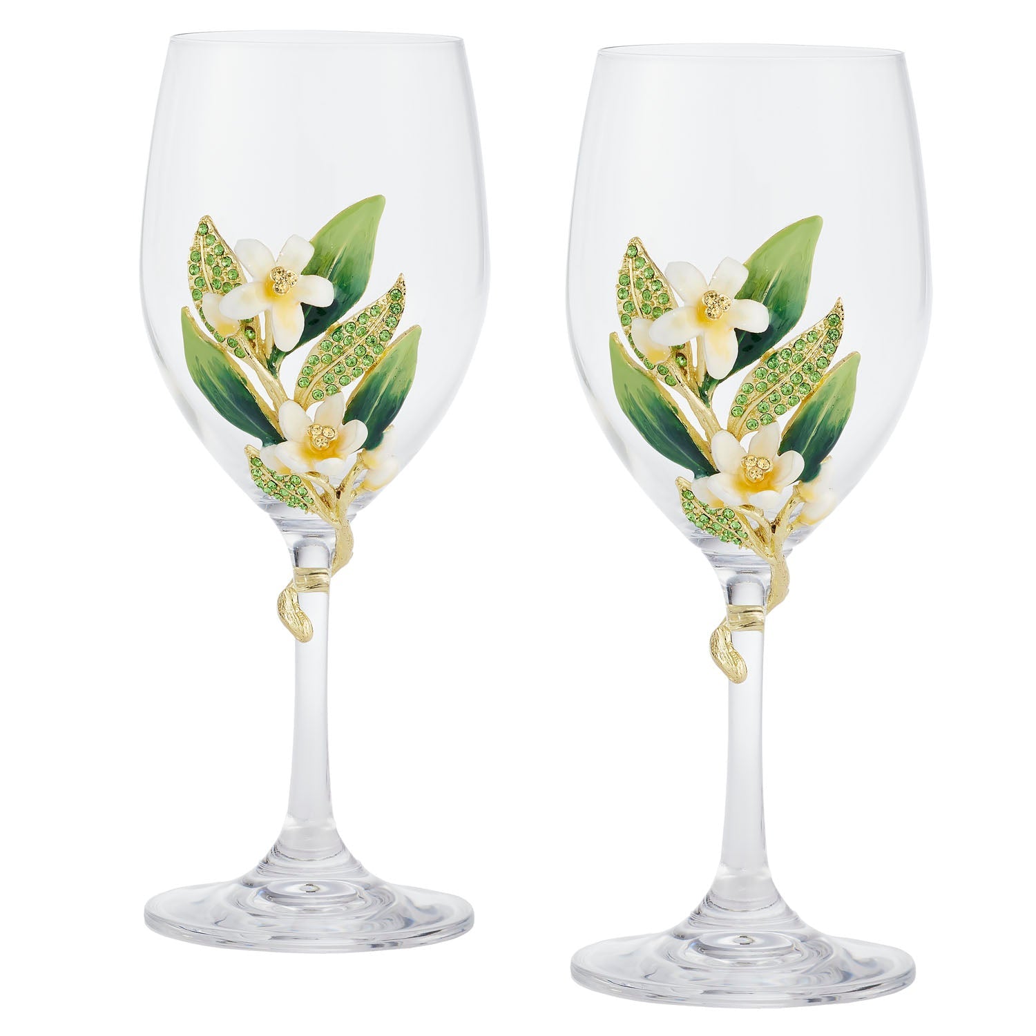 Glass stem, wrapped in floral blossoms richly cast in gold finished pewter, hand-enameling and hand-set Peridot and Jonquil stones. Glass can be acid etched. Hand-wash. Signature luxury gift box included.