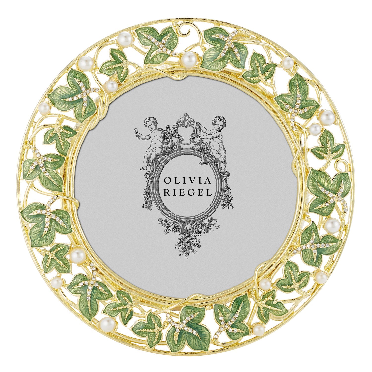 Gold finished pewter ivy vine pattern, encrusted with hand-set clear European crystals and faux pearls. Celadon green toned guilloché style hand-enameling. Elegant champagne hued moiré silk back. Tarnish resistant. Signature luxury gift box included.