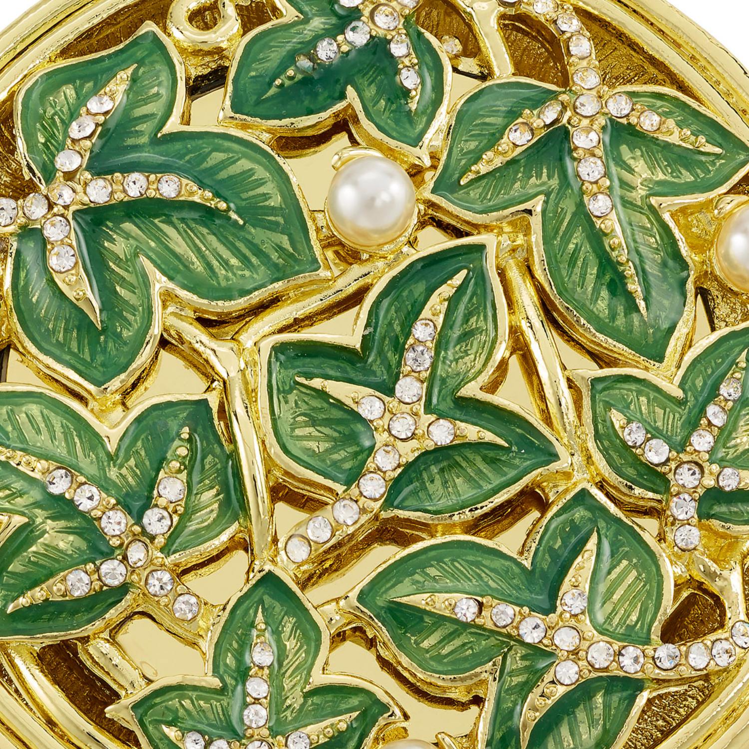 Gold finished pewter ivy vine pattern, with celadon green hued guilloché style hand-enameling.