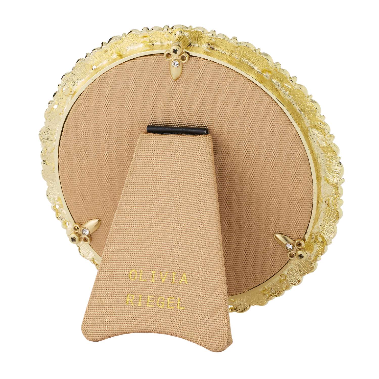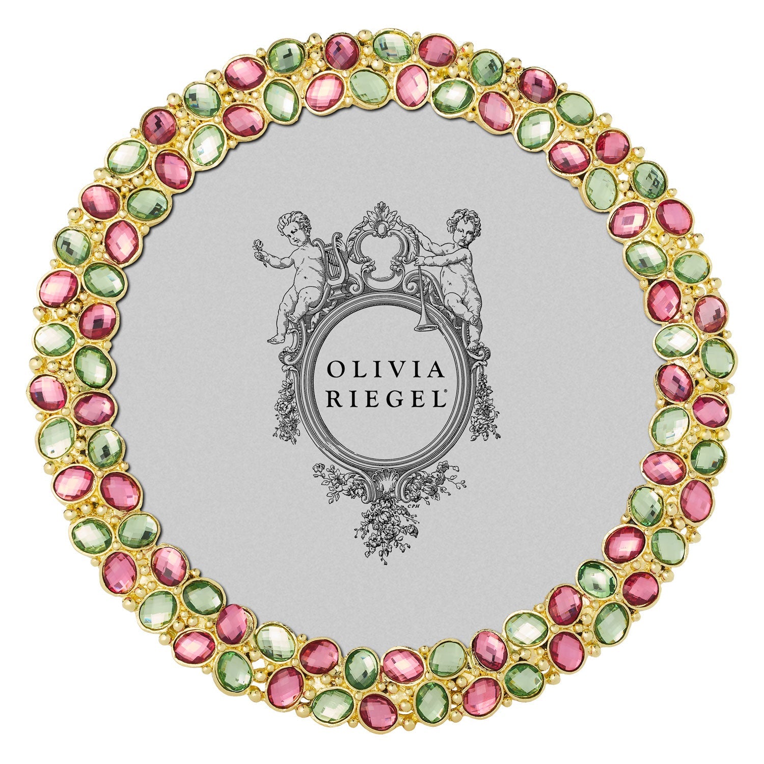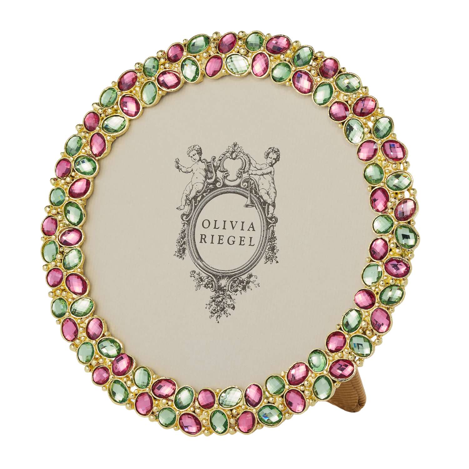 Inspired by the style and glamour of Palm Beach regency. Gold finished pewter, with hand-set pink and green European glass gems. Elegant champagne hued moiré silk back. Tarnish resistant. Signature luxury gift box included.