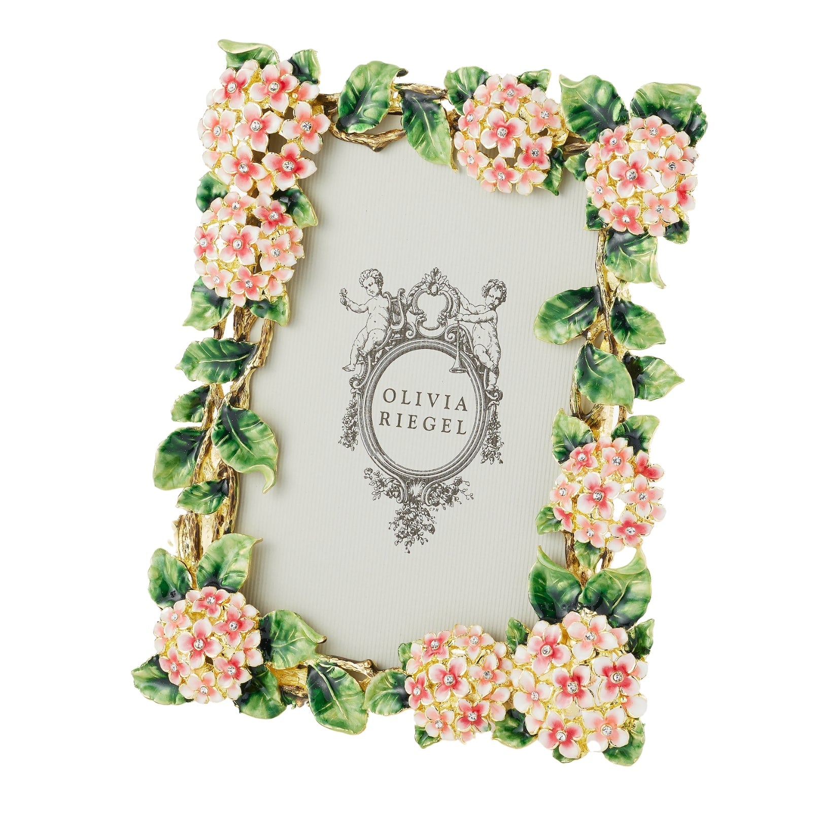 Enchanting floral pattern in gold finished pewter with pink and green hued hand-enameling and hand-set European crystals. Elegant champagne moiré silk back with easel for vertical or horizontal placement. Tarnish resistant. Signature luxury gift box included.