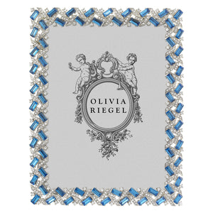 Silver finished pewter, encrusted with clear European crystals and sapphire glass baguette stones. Beveled glass. Elegant gray moiré silk back with easel designed for vertical or horizontal placement. Tarnish resistant.