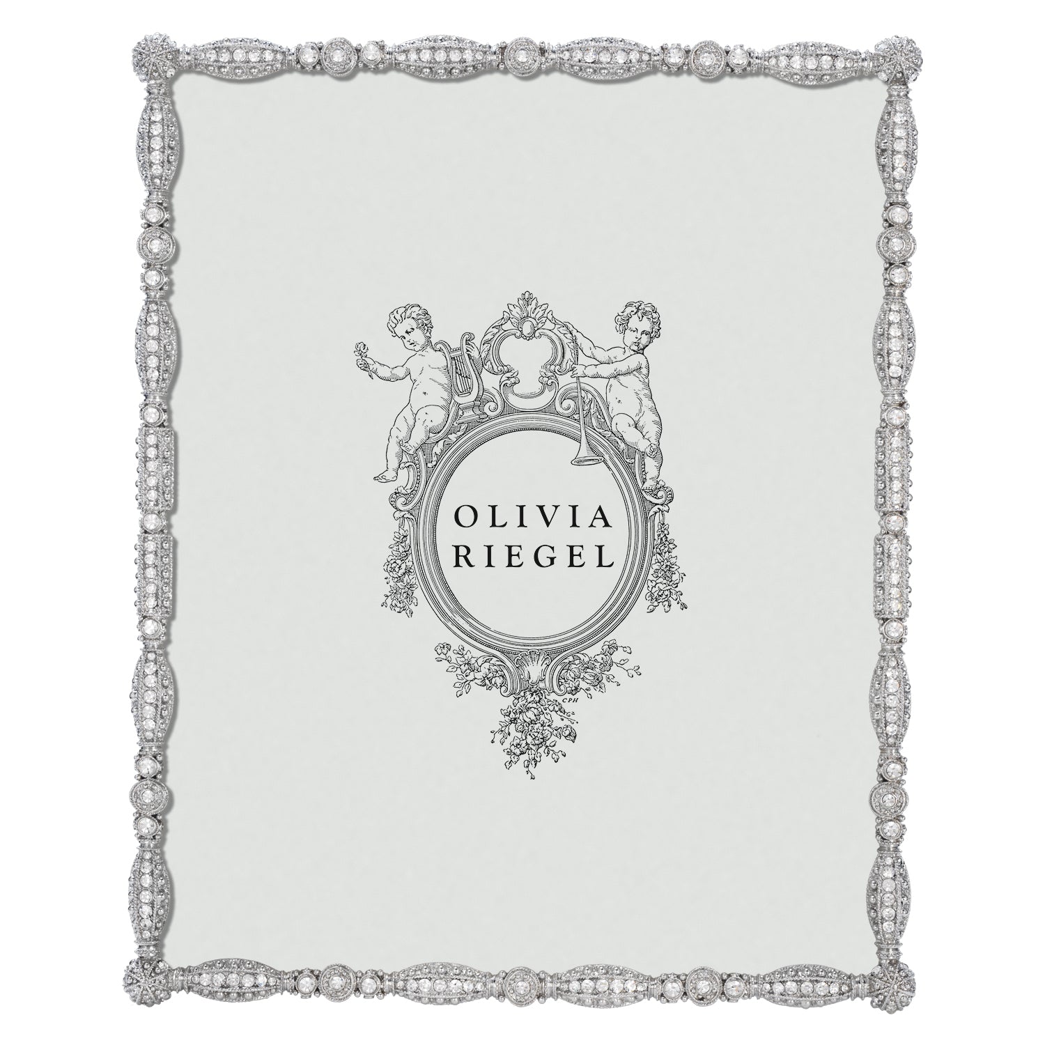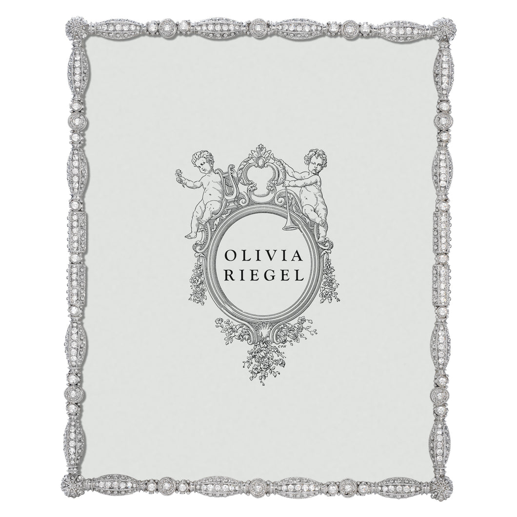 Silver finished pewter with hand-set clear European crystals. Elegant gray moiré silk back with easel designed for vertical or horizontal placement.
