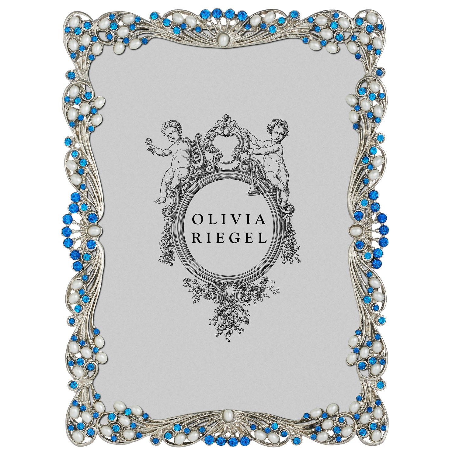 Gold or silver finished pewter filigree work, adorned with hand-set blue European crystals and cultured freshwater pearls. Elegant navy hued moiré silk back with easel designed for vertical or horizontal placement. Tarnish resistant. Signature luxury gift box included.