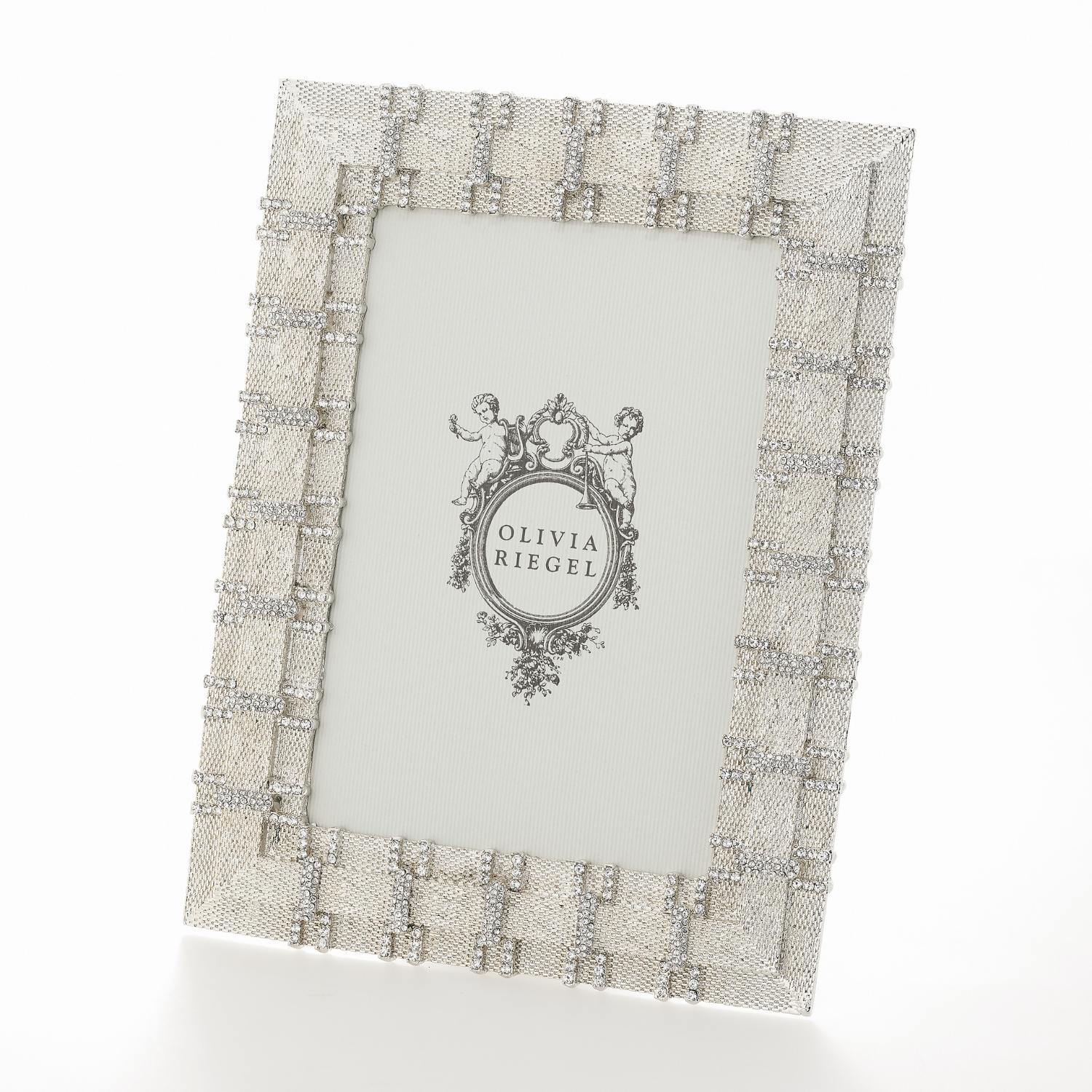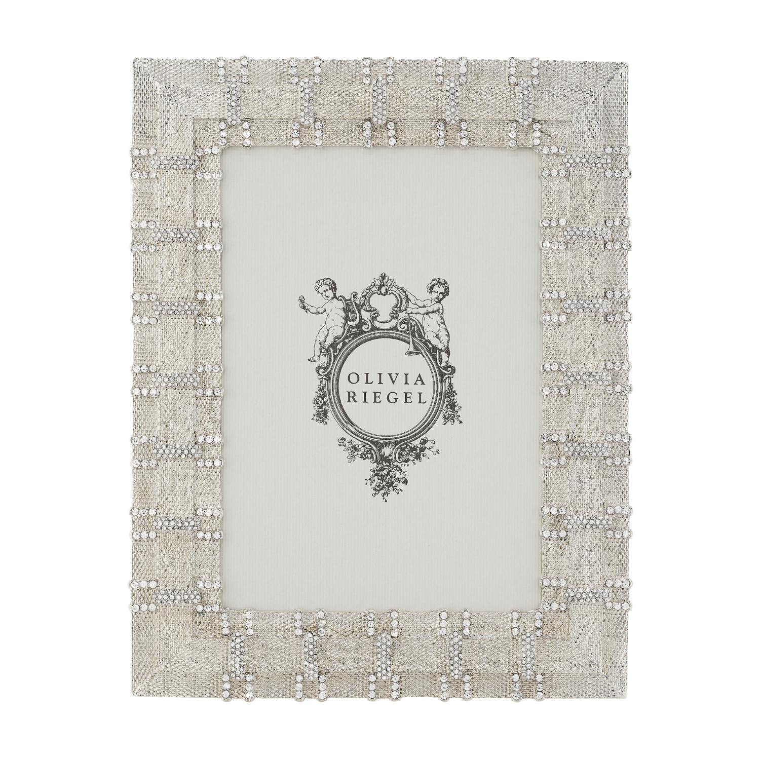 Texturized silver or gold finished pewter banding, heavily encrusted with rows of hand-set clear pavé European crystals. Elegant moiré silk back, with easel designed for vertical or horizontal placement. Beveled glass. Tarnish resistant. Signature luxury gift box included.