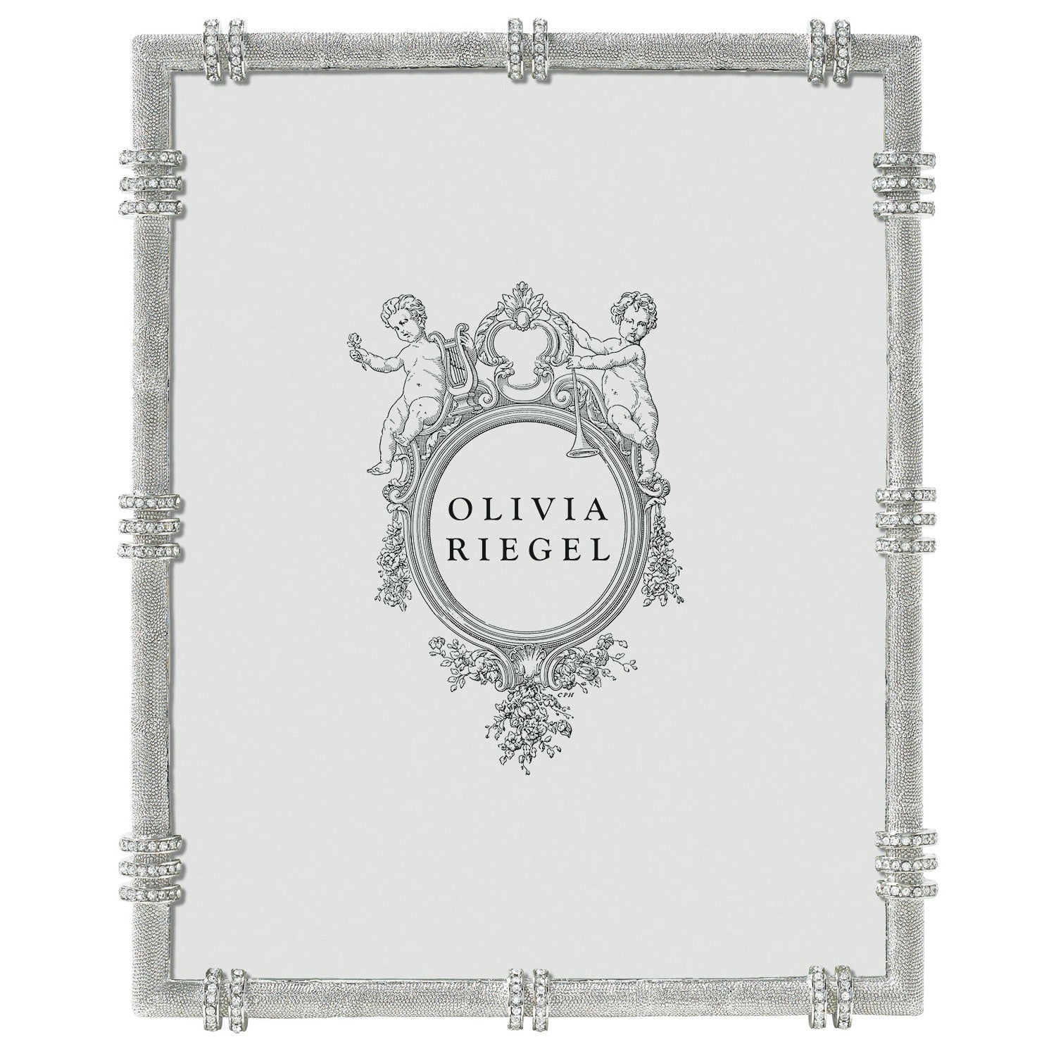 Channel-set clear European crystal banding with textured cast pewter silver tone metal finish and elegant moiré silk back with easel for vertical or horizontal placement. Beveled glass.