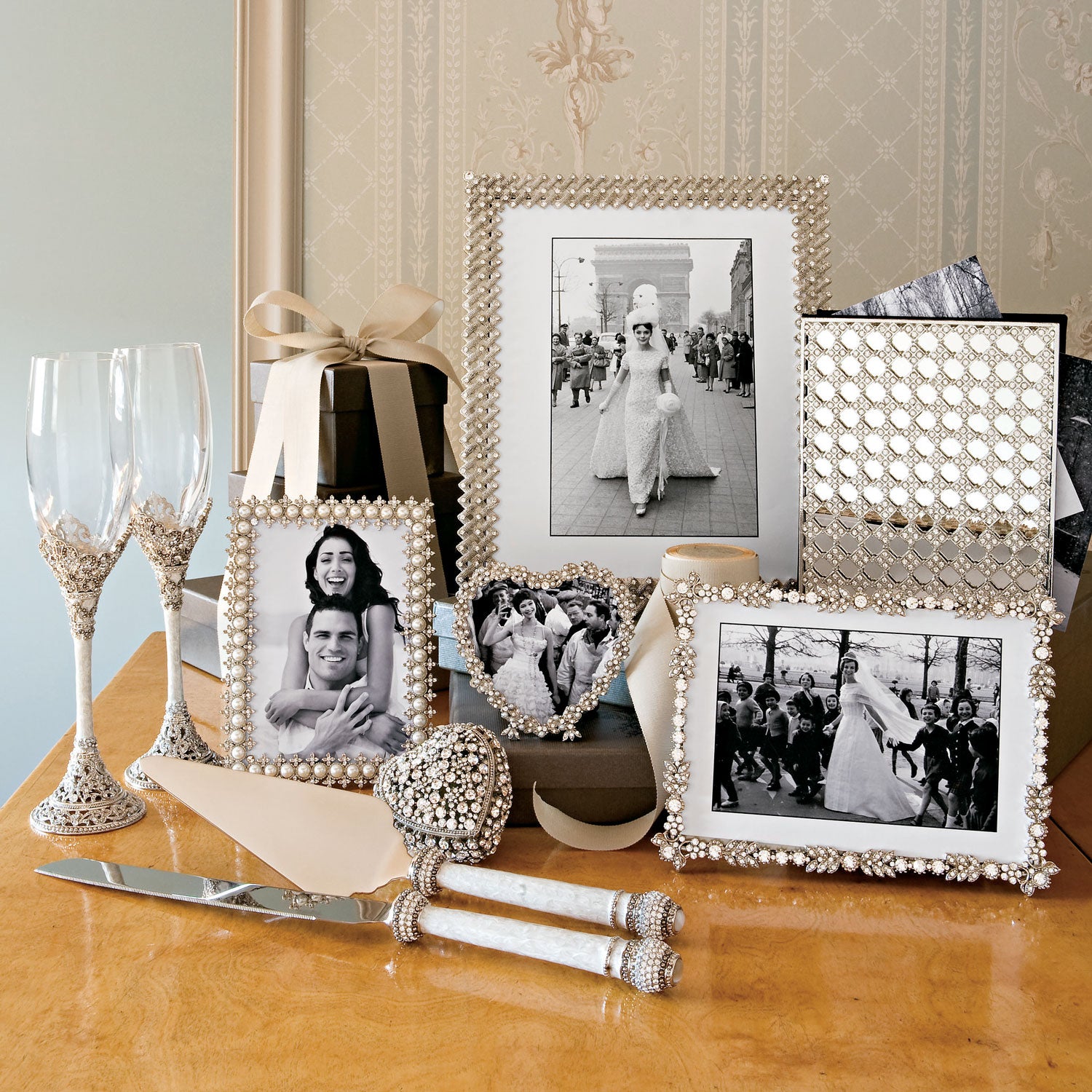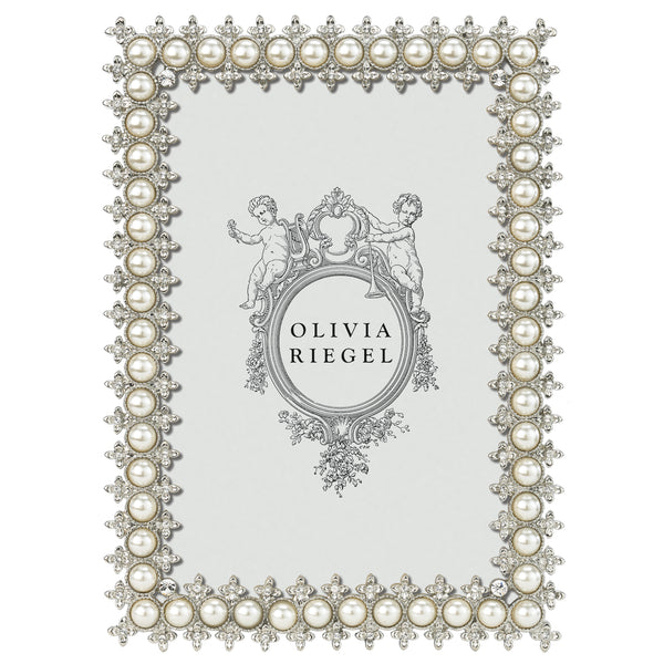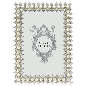 Delicate details with hand-set clear European crystals and faux pearls in silver finished pewter. Elegant gray hued moiré silk easel back designed for vertical or horizontal placement.