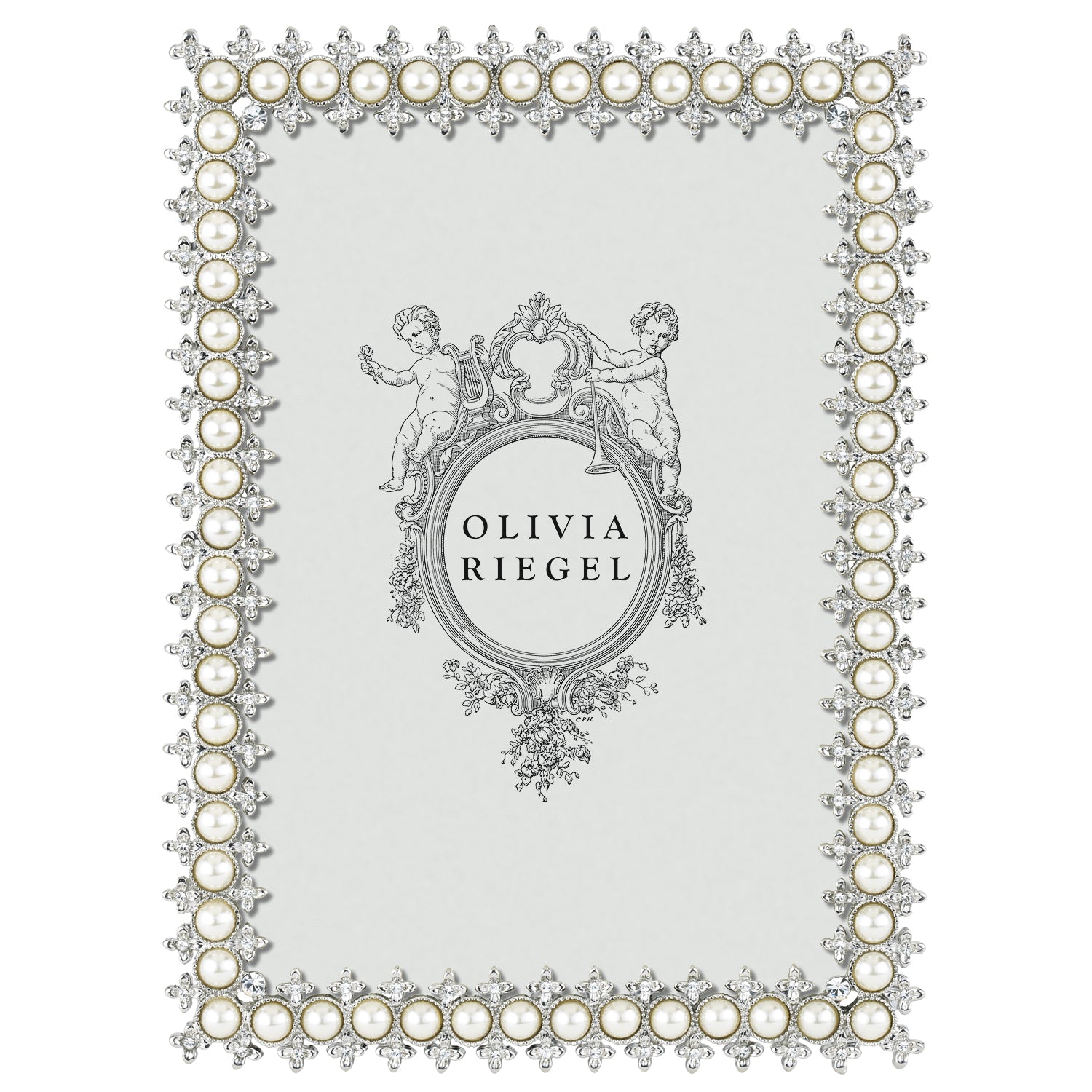 Delicate details with hand-set clear European crystals and faux pearls in silver finished pewter. Elegant gray hued moiré silk easel back designed for vertical or horizontal placement.