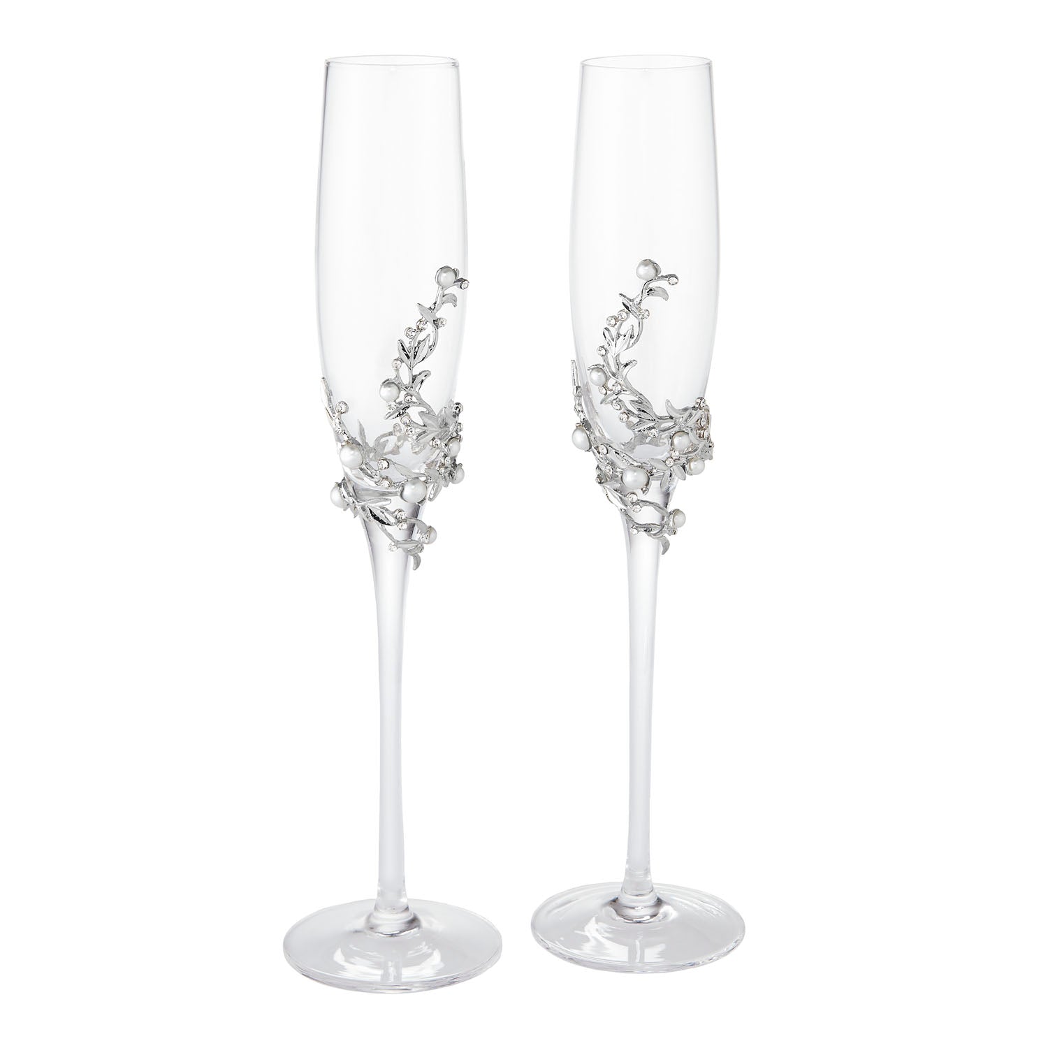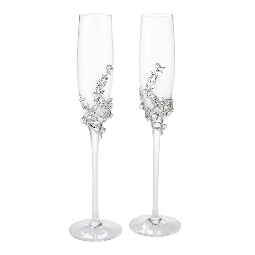 Glass stem, wrapped with silver finished pewter adornment. Encrusted with hand-set clear European crystals and faux pearls. Glass can be acid etched. Hand-wash. Signature luxury gift box included.