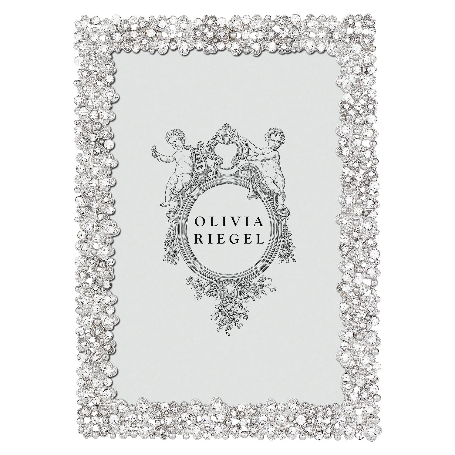 Silver finished cast pewter with hundreds of hand-set clear European crystals. Beveled glass. Elegant gray moiré silk back with easel designed for vertical or horizontal placement.