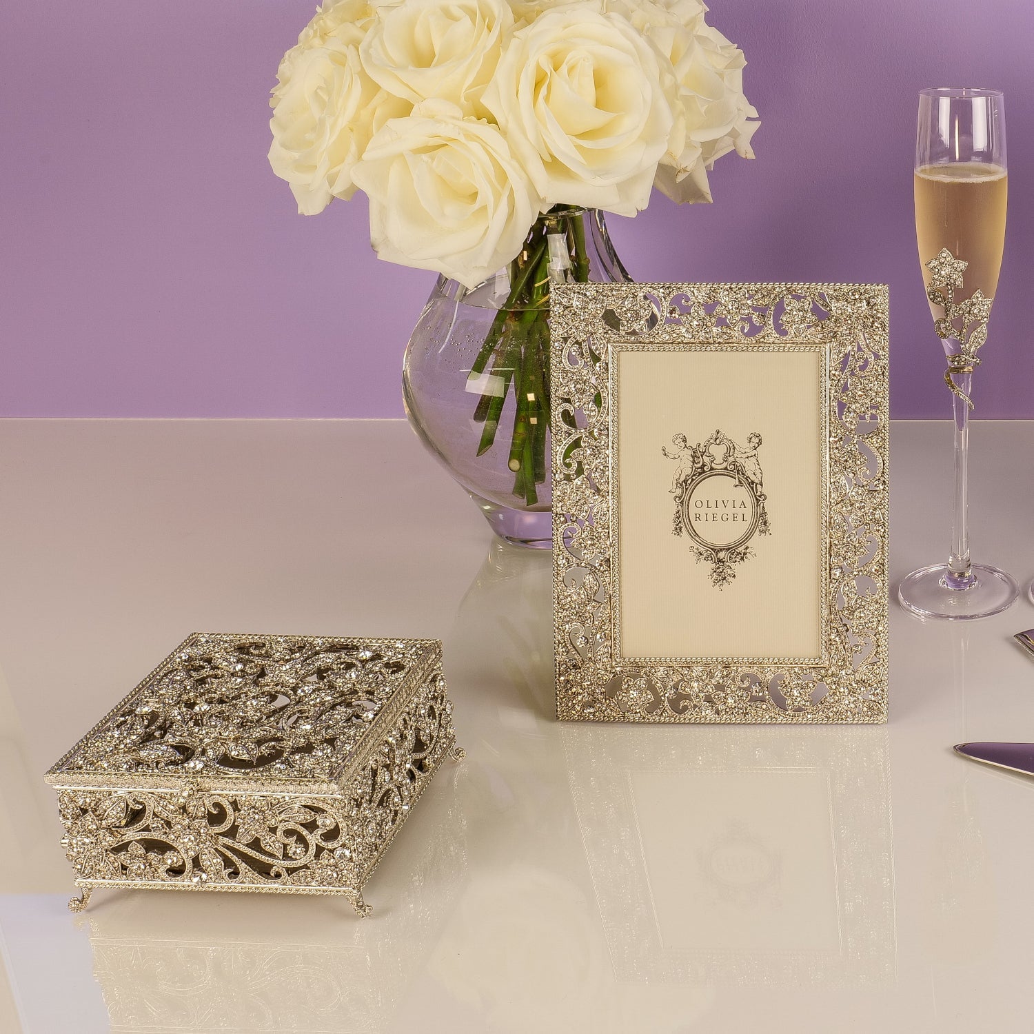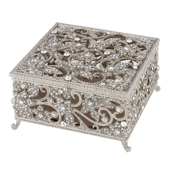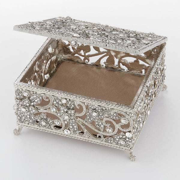 Silver finished pewter floral pattern, richly encrusted with hand-set clear European crystals. Elegant gray hued moiré silk lining. Hinged lid. Tarnish resistant. Signature luxury gift box included.