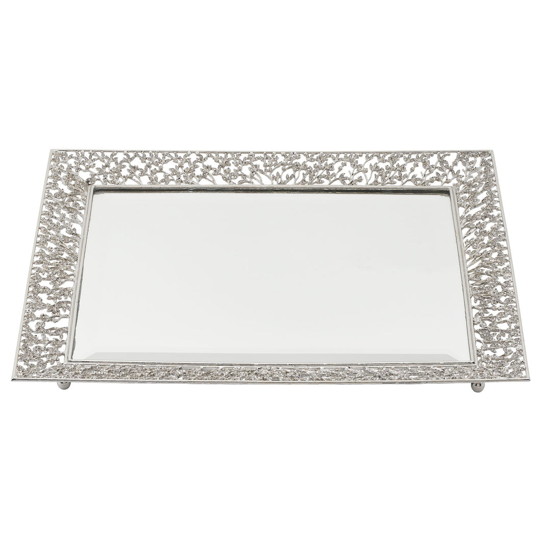 Contemporary intricate silver finished pewter branch pattern, adorned with hand-set clear European crystals. Elegant gray moiré silk underside. Beveled mirrored glass. Ball footed base. Tarnish resistant. Signature luxury gift box included.