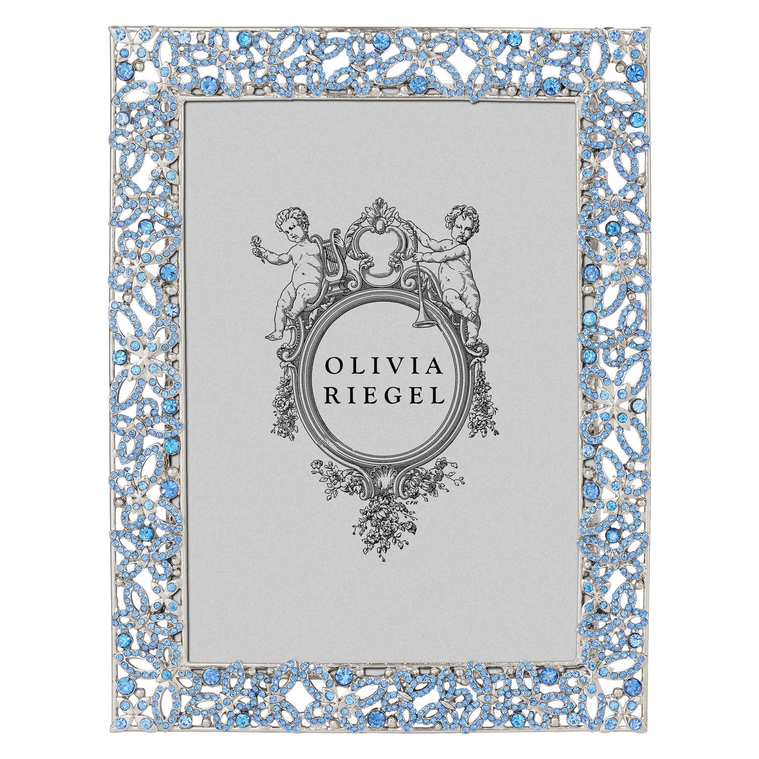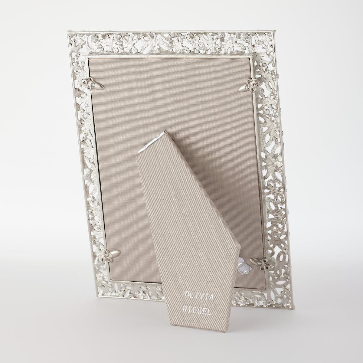 Silver finished pewter butterfly pattern, encrusted with hand-set sapphire European crystals. Elegant gray moiré silk back, with easel designed for vertical or horizontal placement. Tarnish resistant. Signature luxury gift box included.