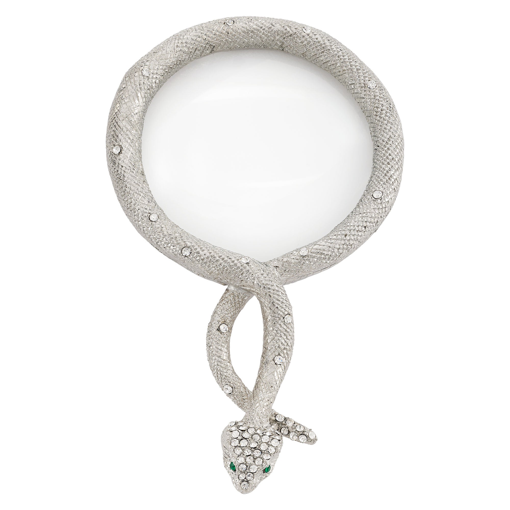 Celebrate the wisdom and mystery of the 2025 year of the snake with this chic gold or silver finished pewter serpent patterned magnifying glass. Encrusted with hand-set clear pavé European crystals and emerald green crystal eyes. 2x magnification. Tarnish resistant. Signature luxury gift box included.