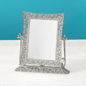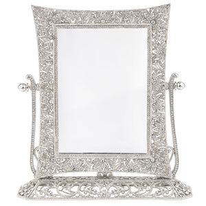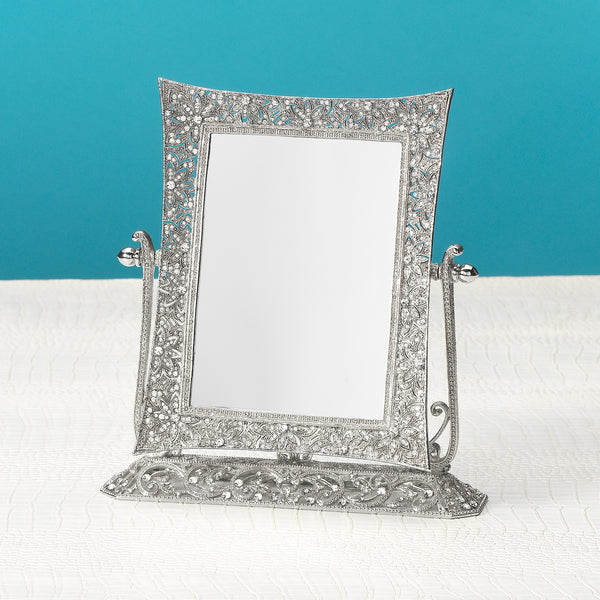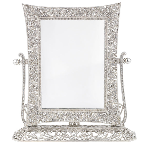 Estate jewelry inspiration in silver finished cast pewter with hundreds of hand-set clear European crystals. Swiveling mirror with 3x magnification and elegant gray moiré silk back.