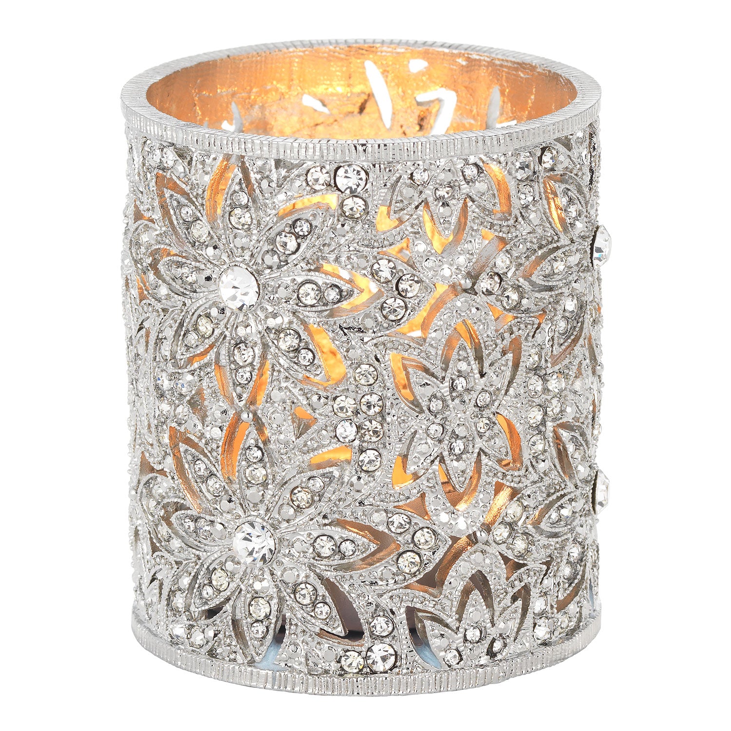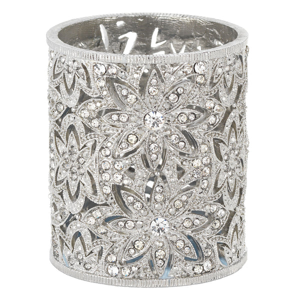 Estate jewelry inspired pattern in silver finished cast pewter. Hand-set clear European crystals and light blue hand-enameled interior.