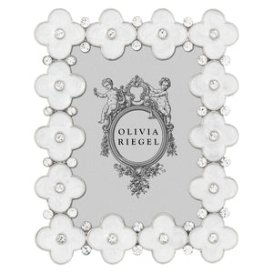 Inspired by the historic quatrefoil design—a decorative element utilized in architecture and the arts for millennia. Silver finished pewter, with sumptuous white hand-enameling and hand-set clear European crystals. Elegant gray moiré silk back designed for vertical or horizontal placement. Tarnish resistant.