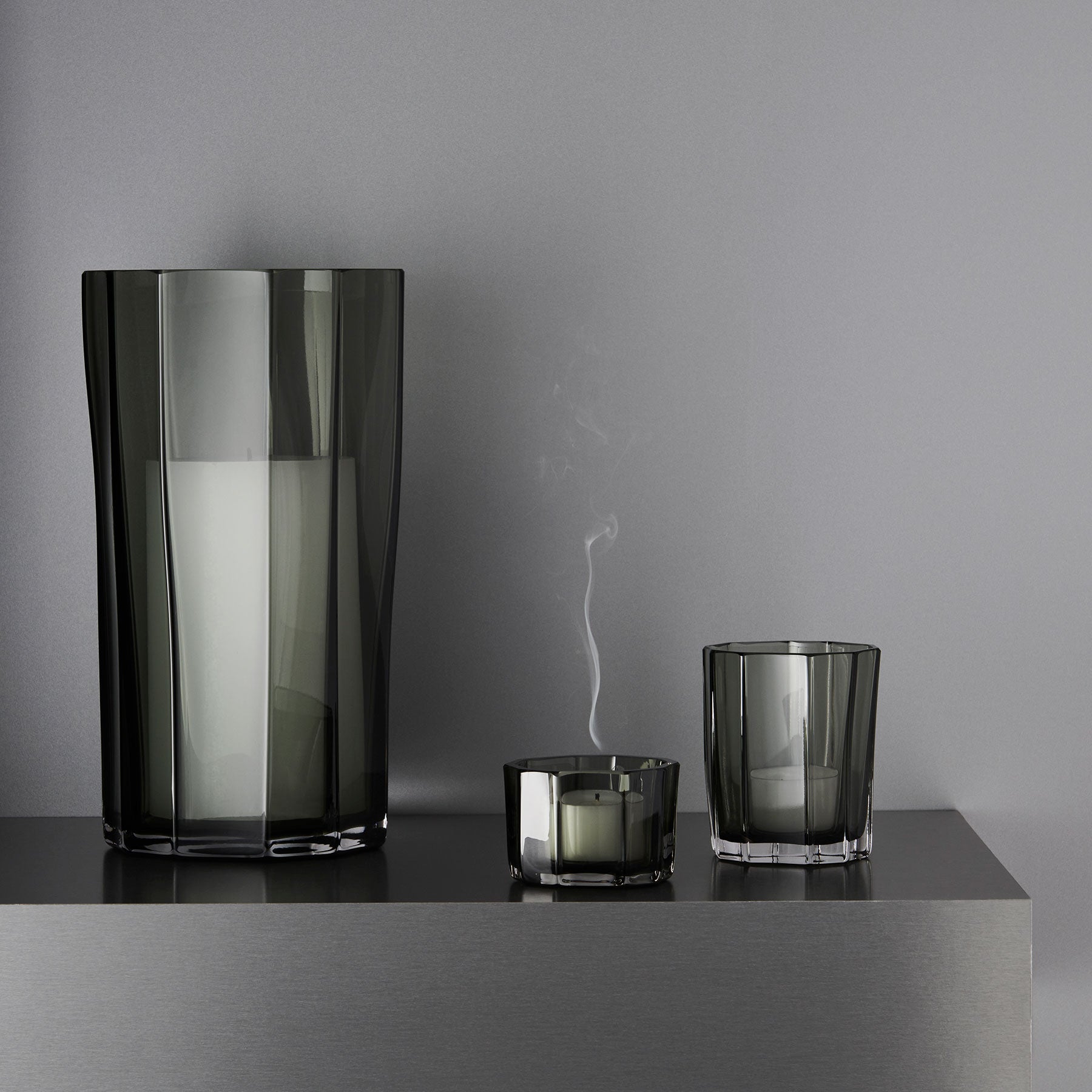 With Reed, Monica Förster highlights the folds and in the process creates a sense of organic movement. A gentle swaying in the hard glass. The collection features a variety of vases, two votives and a hurricane lamp. This votive is made of moss green glass and is3.5 inches high.