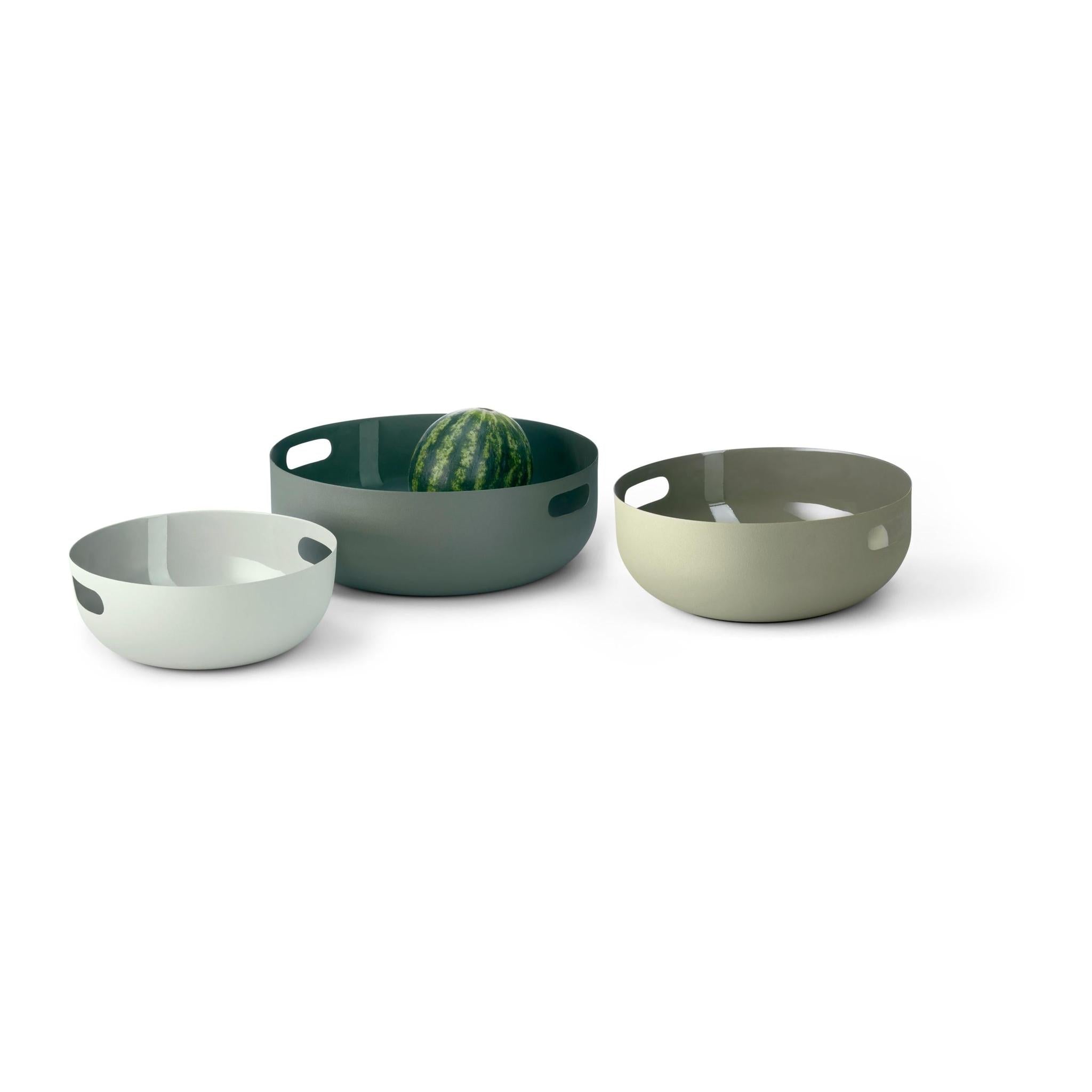 As if the COPENHAGEN 3-piece bowl set´s shape, color, and material didn´t already attract enough attention amidst the kitchen´s monotony, designers have even added side inserts to complement the ultra-practical function of a tray, when needed Nordic cool, matt powder-coated outside, glossy enamel inside, made of durable steel including an endless list of possibilities - here are just a couple: Bread basket, bowl for pasta, rice, salad, decorative bowl for fruit, walnuts, Christmas cookies and so much more. When not in use, they can be conveniently stacked inside each other; however, it´s just a shame to hide them away in a dark drawer afterward.