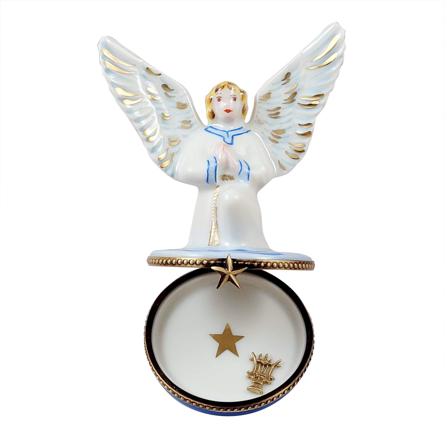 The Rochard "Angel Gabriel with Brass Instrument" Limoges Box is artfully and colorfully hand painted by premier artists using many of the same techniques that were used during their introduction in the 17th century. Steeped in history, Limoges boxes feature exquisite designs, superior workmanship, and the ultimate attention to detail.