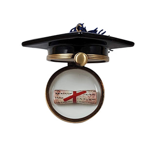 The Rochard Limoges "Black Graduation Cap With Diploma" box is artfully and colorfully hand painted by premier artists using many of the same techniques that were used during their introduction in the 17th century. Steeped in history, Rochard Limoges boxes feature exquisite designs, superior workmanship, and the ultimate attention to detail.