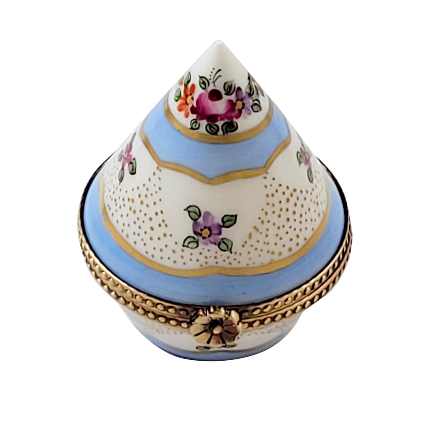 The Rochard "Floral Light Blue & Gold Cone Shape" Limoges Box is artfully and colorfully hand painted by premier artists using many of the same techniques that were used during their introduction in the 17th century. Steeped in history, Limoges boxes feature exquisite designs, superior workmanship, and the ultimate attention to detail.
