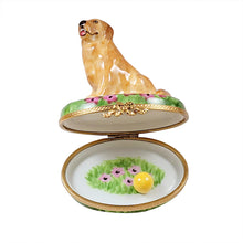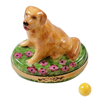 The Rochard "Golden Retriever on Flowers with Removable Ball" Limoges Box is artfully and colorfully hand painted by premier artists using many of the same techniques that were used during their introduction in the 17th century. Steeped in history, Limoges boxes feature exquisite designs, superior workmanship, and the ultimate attention to detail.