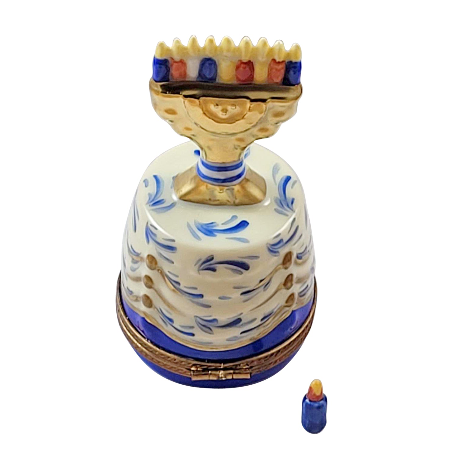 The Rochard "Hanukkah Menorah on Table with Removable Candle" Limoges Box is artfully and colorfully hand painted by premier artists using many of the same techniques that were used during their introduction in the 17th century. Steeped in history, Limoges boxes feature exquisite designs, superior workmanship, and the ultimate attention to detail.