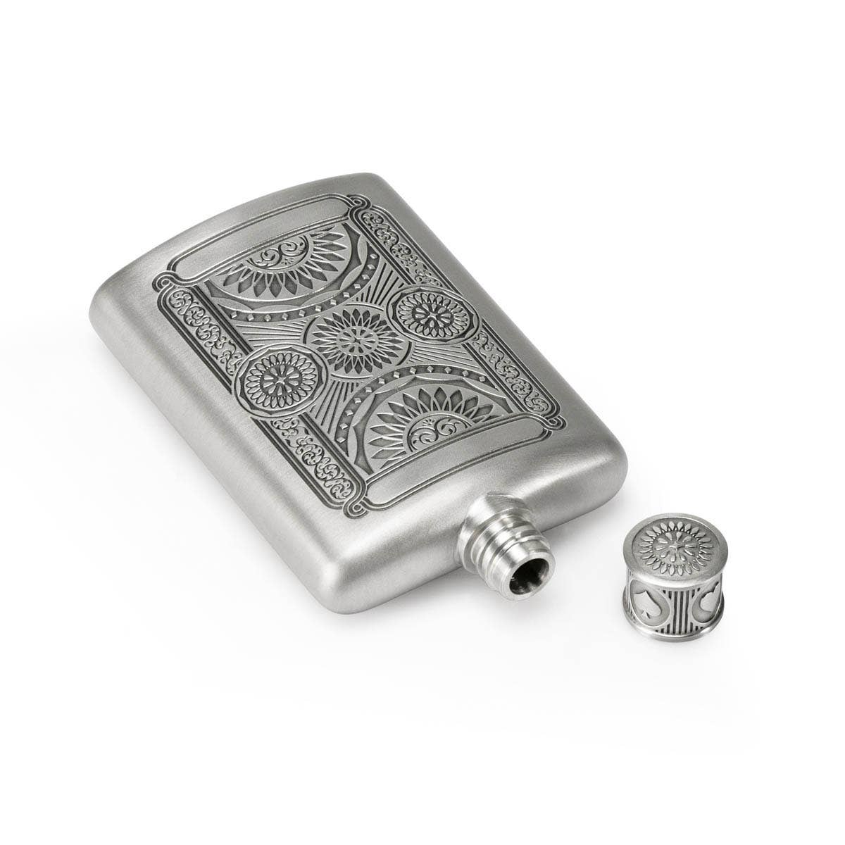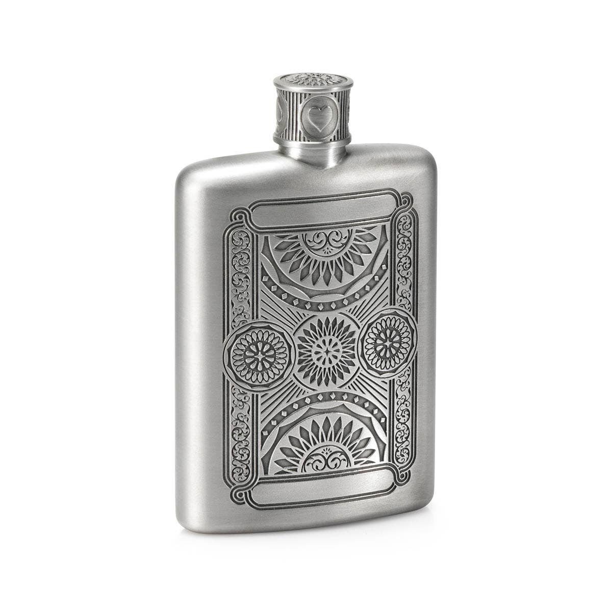 Given the rakish flair of Wild West playing card graphics, attempting a surreptitious swig from this all-pewter hip flask might be an exercise in futility.