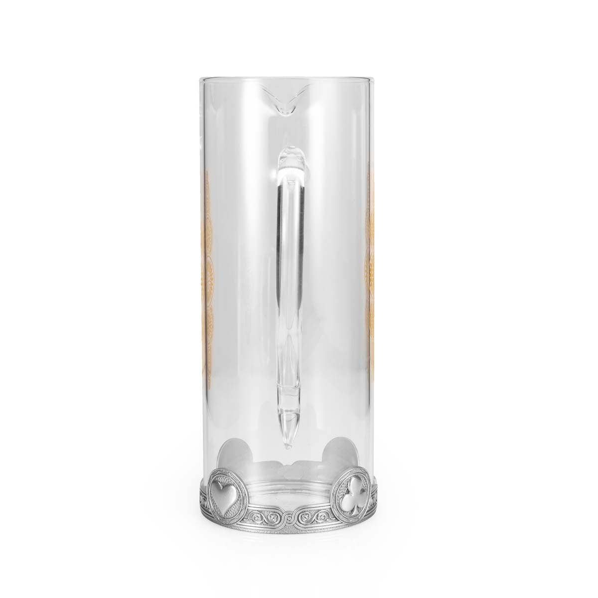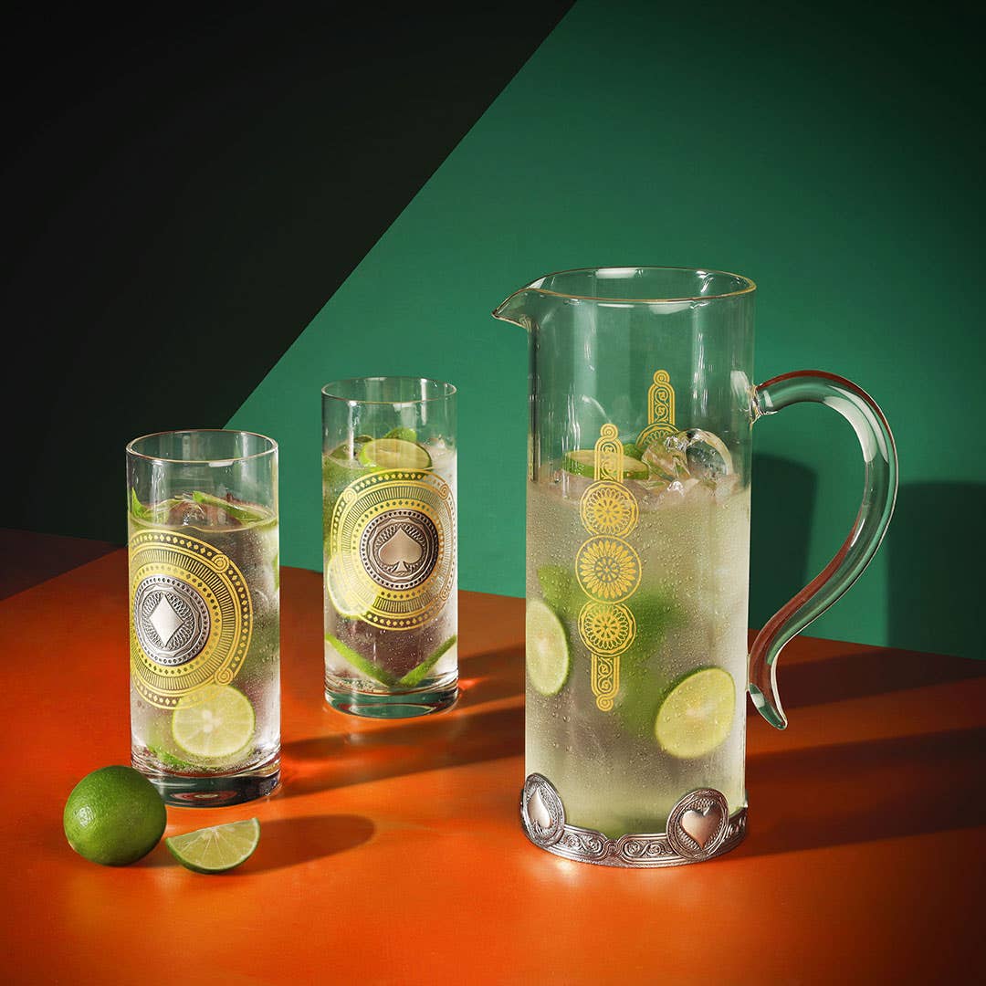 The Ace Pitcher is crafted from refined glass and features gold-toned roundels with a pewter ring adorned with heart, diamond, ace, and spade symbols. It combines Victorian-Edwardian elements with practical design for effortless pouring and handling.