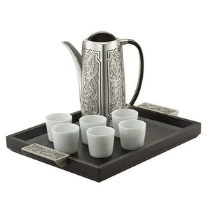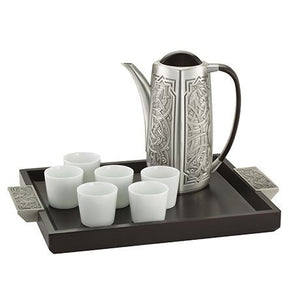 Hospitality takes on a Middle Eastern flavour in a coffee service that acknowledges the preference for shots of intense coffee. Comprising 6 demitasse cups in white porcelain, and a coffee pot and tray in wood and satin finish pewter sculpted with scrolling arabesques, this service turns a coffee afternoon into an occasion.