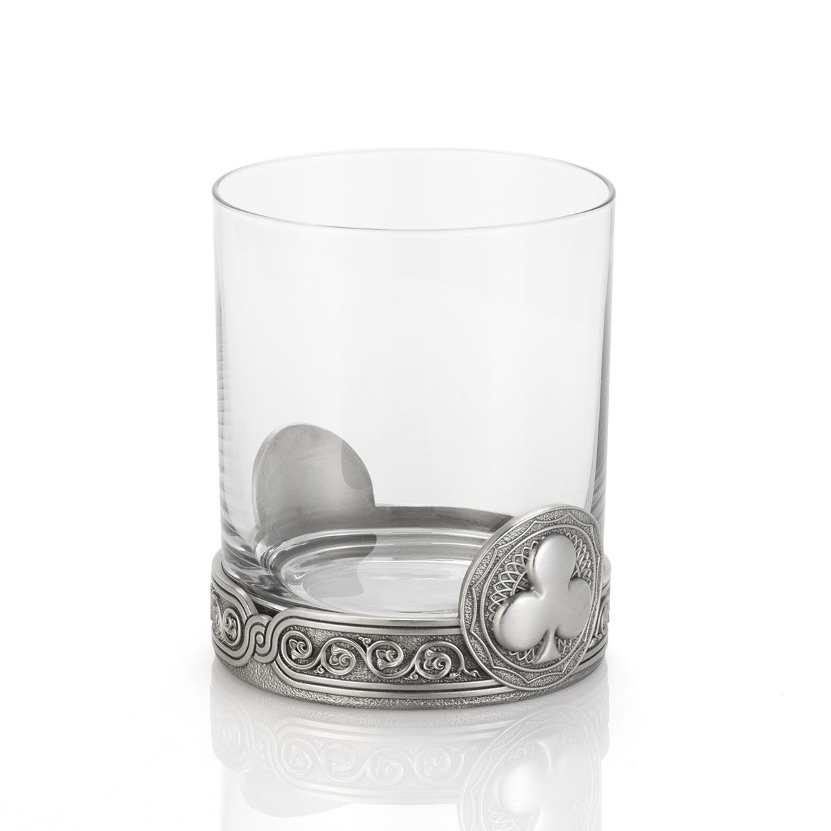 Club pips, with a form variously ascribed to acorns, clover, flowers and batons, wrap the glass tumbler in pleasingly sculpted pewter.
