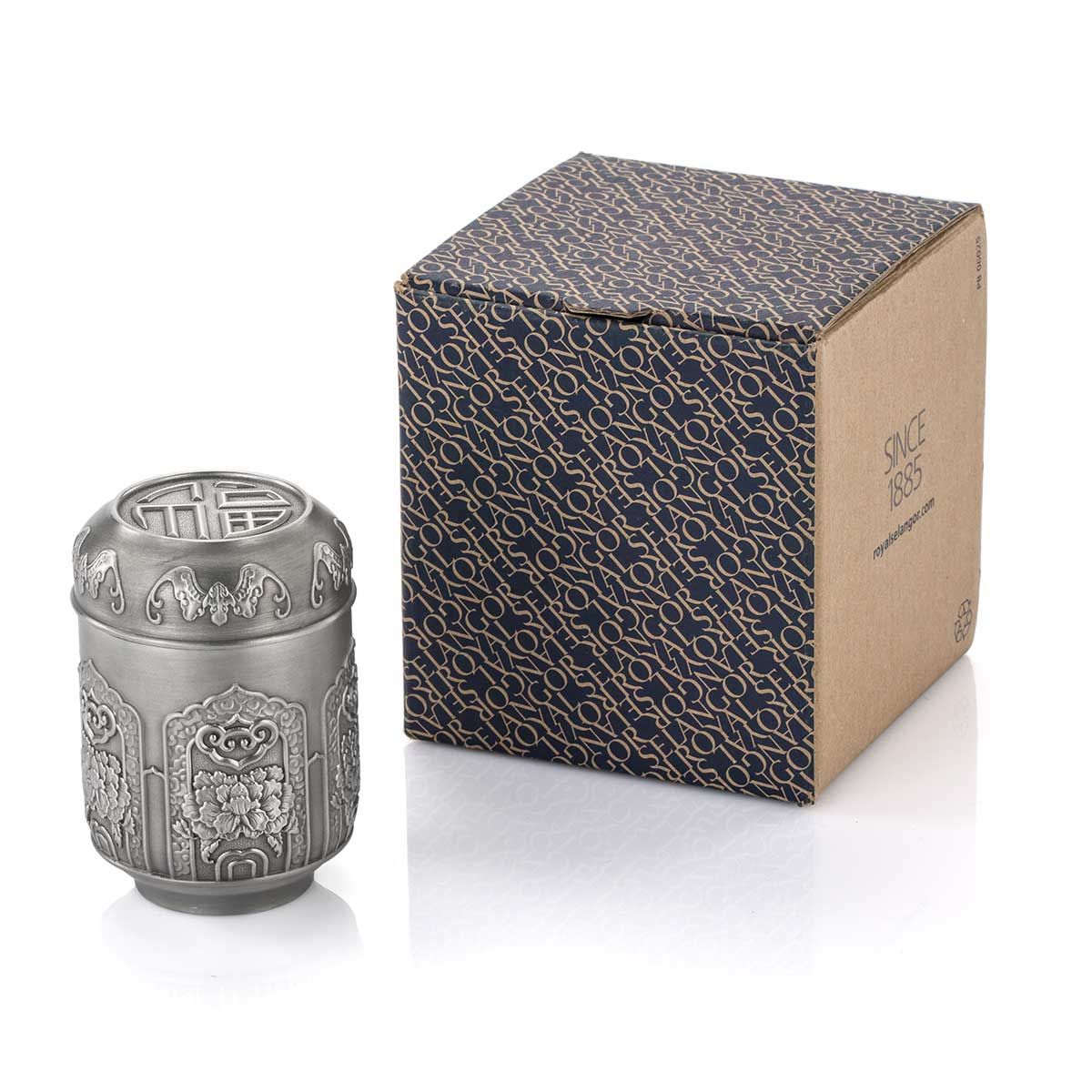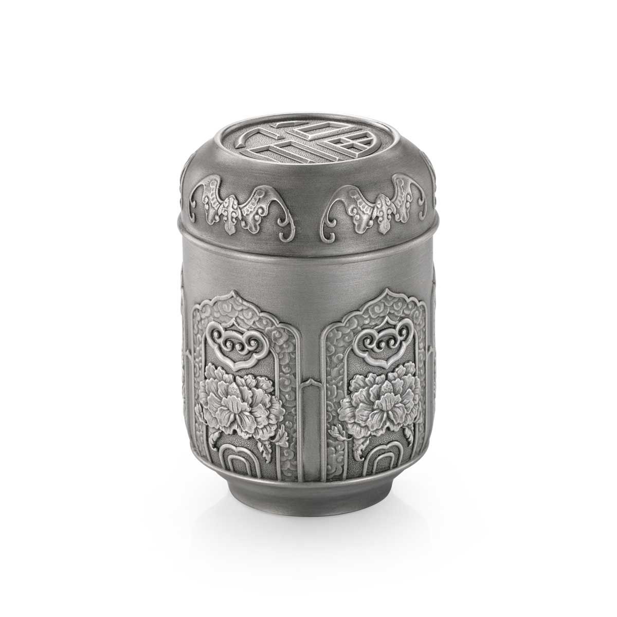 Whether tea leaves, tisanes or ground coffee, the travel caddy’s screw-top lid ensures the possibility of enjoying a satisfying brew en route instead of shaking its contents out of the luggage. The wufu on the lid encircle a faceted fu character, whilst clouds, lingzhi and peonies fill the stylised lotus petals surrounding the body.