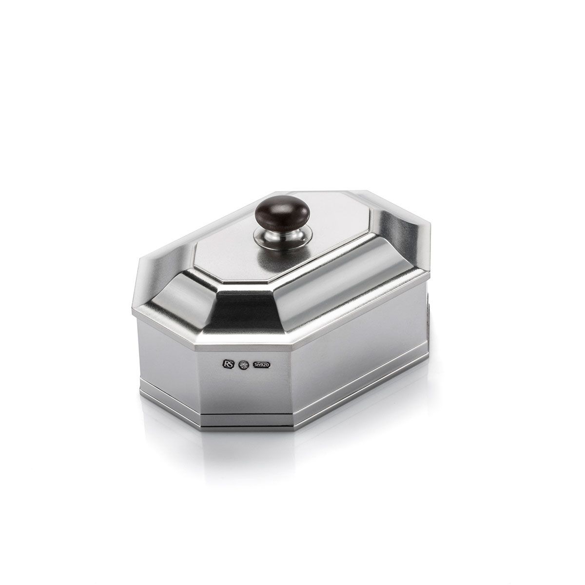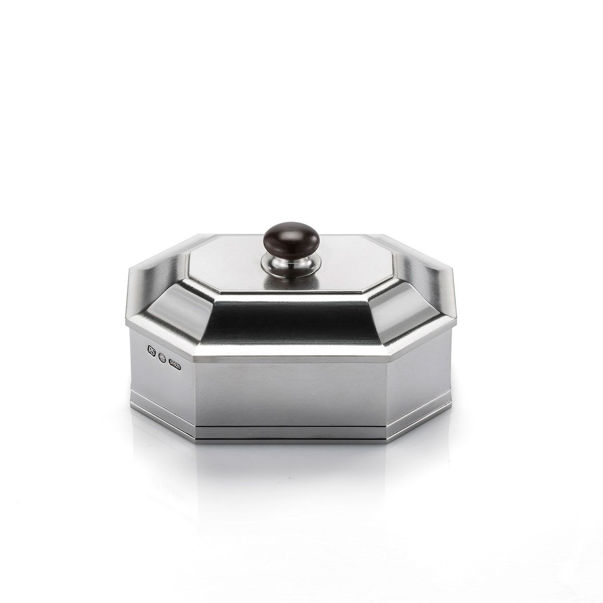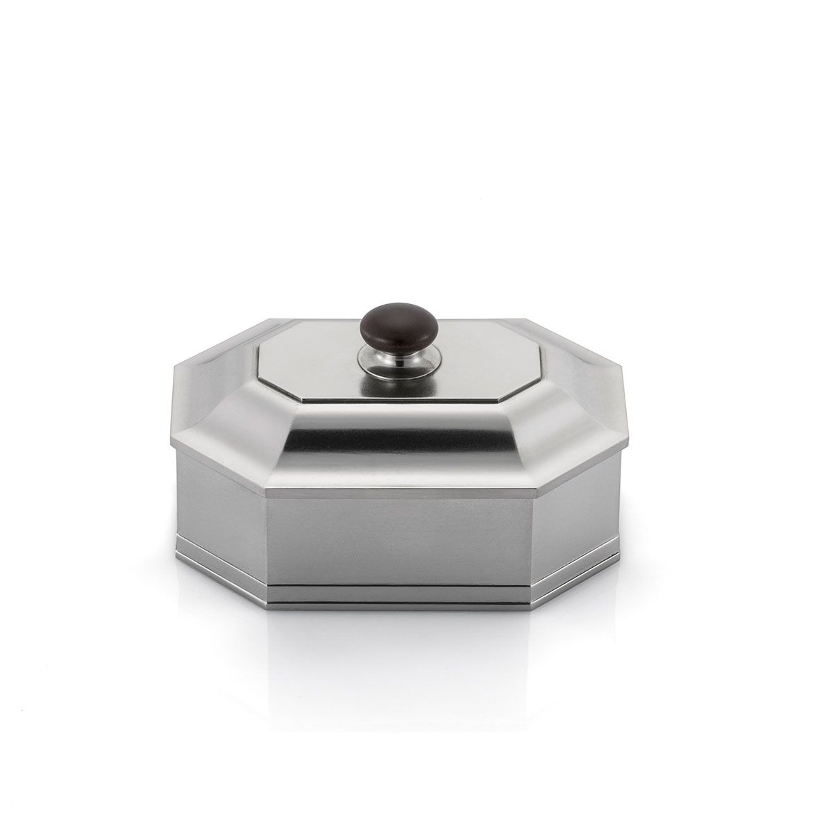 This dignified octagonal container, adapted from a late 1800s Palladian-style tobacco box, echoes a favourite shape of 3rd American president Thomas Jefferson, an accomplished architect, as well as politician, lawyer and planter. In brilliant finish pewter, with a wood finial in walnut-stained nyatoh.