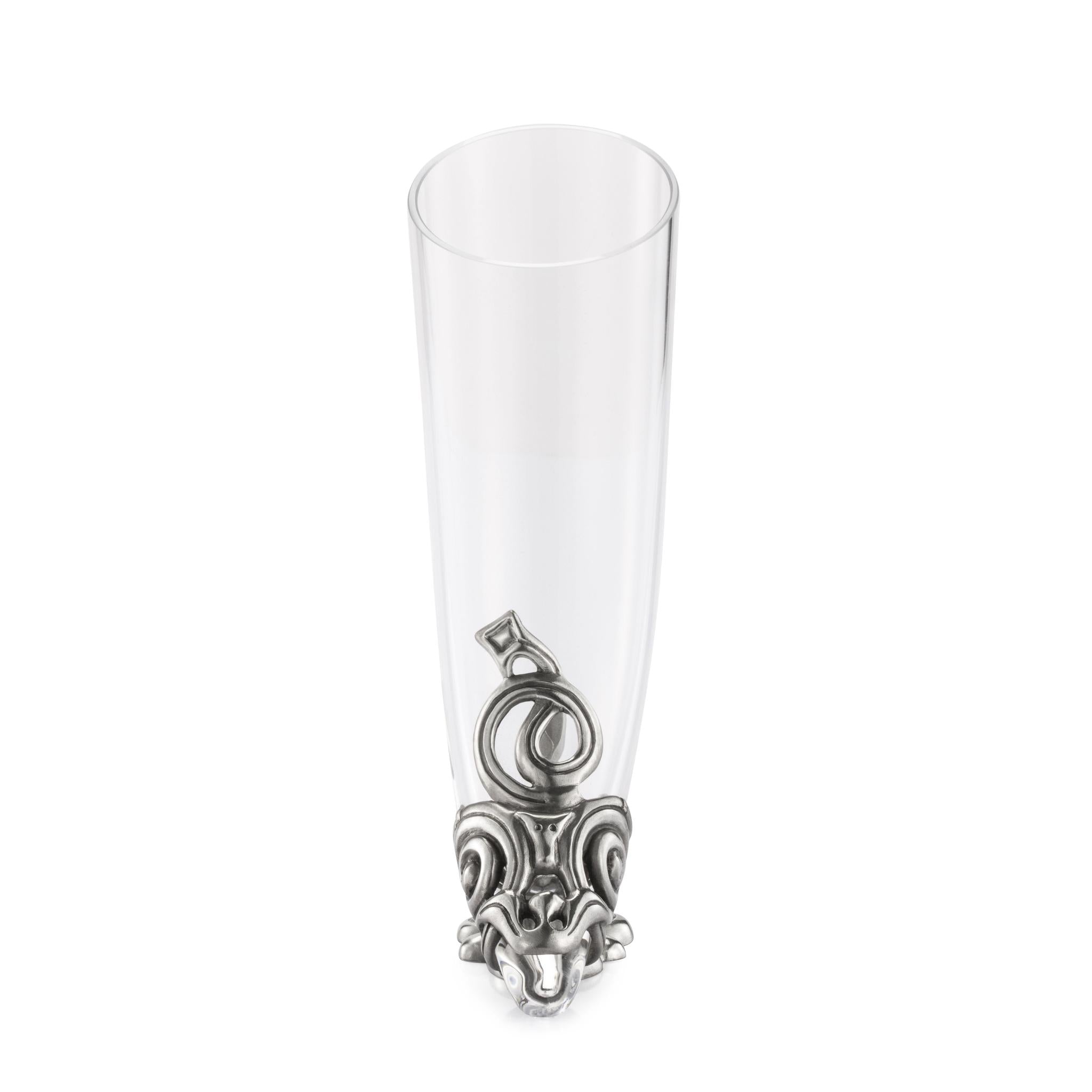 Sinuous serpents in pewter, taken from a bishop chess piece, coil around a half-pint glass fashioned after that most evocative of the period’s vessels, a drinking horn.