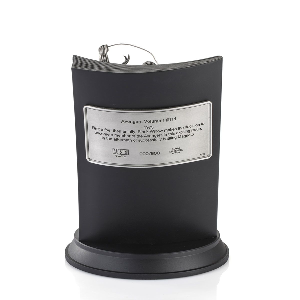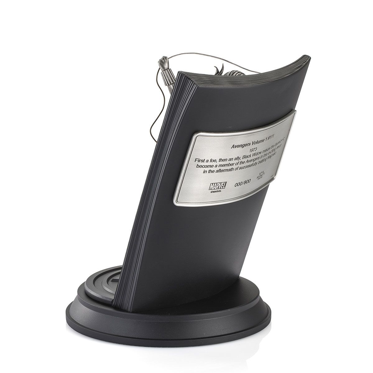 An issue significant for her officially becoming a member of the Avengers, illustrator Alan Quah and sculptor Ghim Ong reimagines the Black Widow in glorious 3D, flying out of John Romita, Joe Sinnott and Gaspar Saladino’s punchy 1973 cover art in finely detailed pewter.