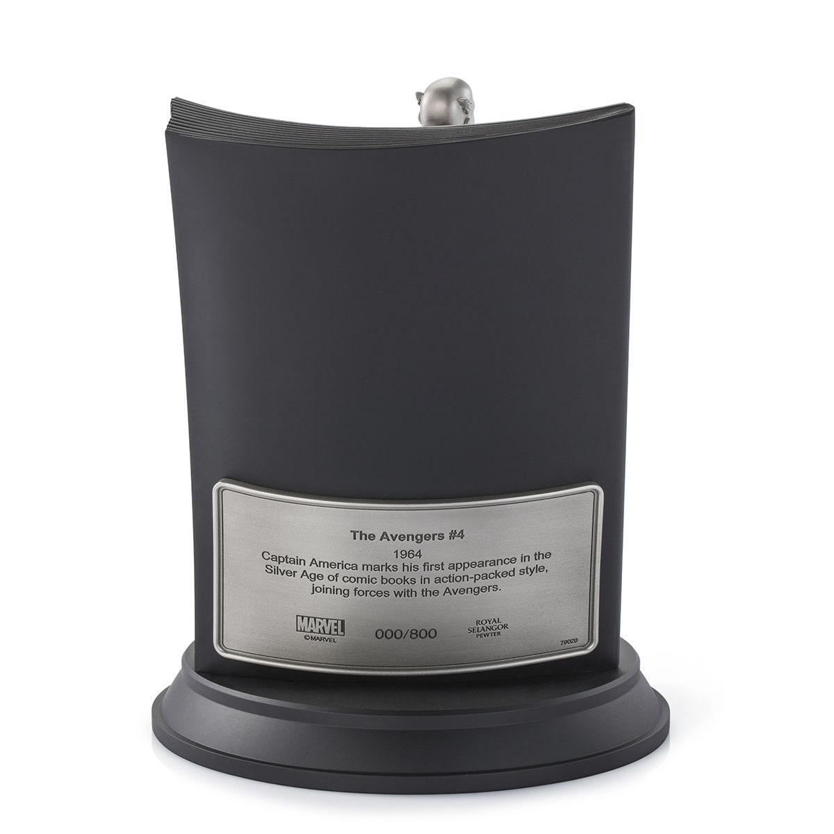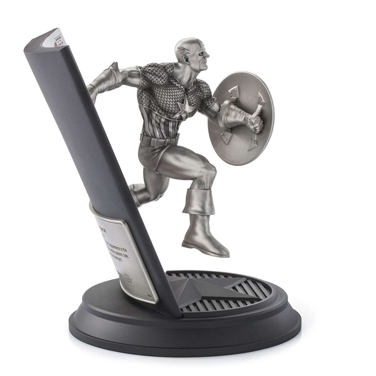Steve Rogers leaps from the page, clad in what is widely considered the quintessential Captain America uniform. Spectacularly reinterpreted by illustrator Alan Quah and sculptor Ghim Ong, every detail from winged helmet to scaled quilting is meticulously recreated in pewter.