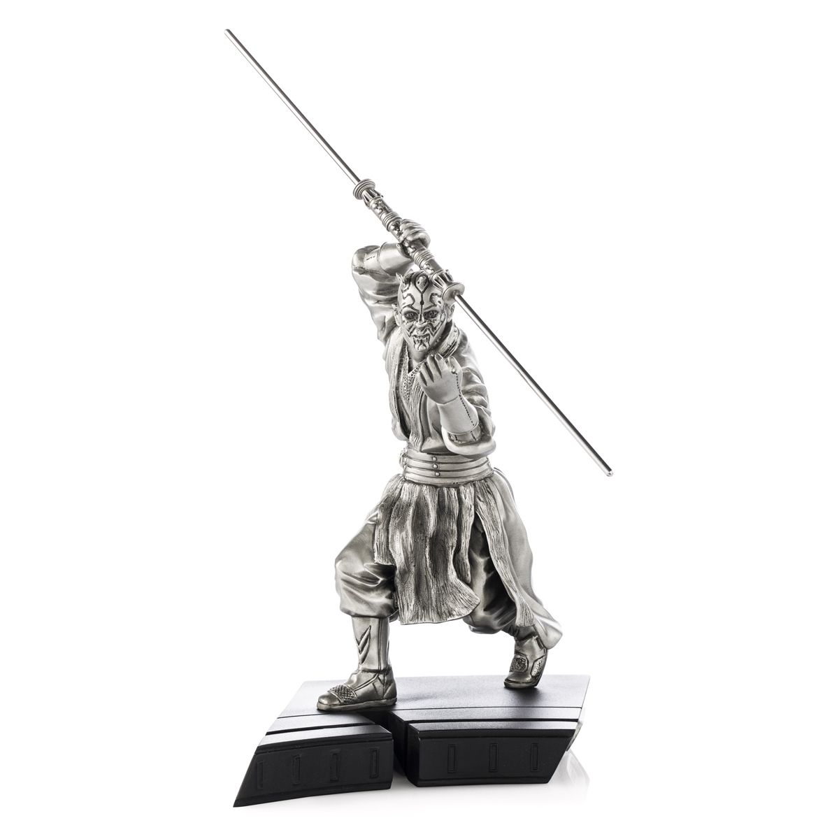 Our pewter sculpture captures Maul in all his deadly elegance, wielding his double-bladed lightsaber as he arrogantly taunts the Jedi Master and his Padawan.