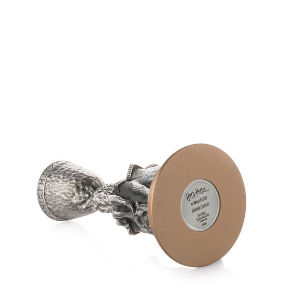 Sculpted in satin finish pewter, this approximately 1/7 scale limited edition replicates every element of the original movie prop from the bold chisel texture of the Goblet, to the Gothic architectural detailing of its stem and foot. A composite resin base in a bronze finish enhances the replica’s visual stature.