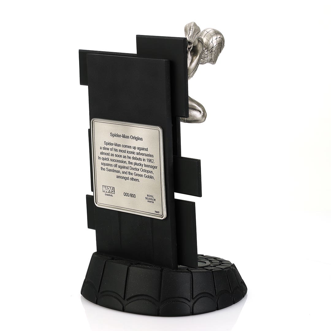 Perched high atop a meticulously designed backdrop adorned with iconic villains essential to Spider-Man's history, this collectible masterpiece captures the web-slinger in his signature pose, surveying the sprawling cityscape below.