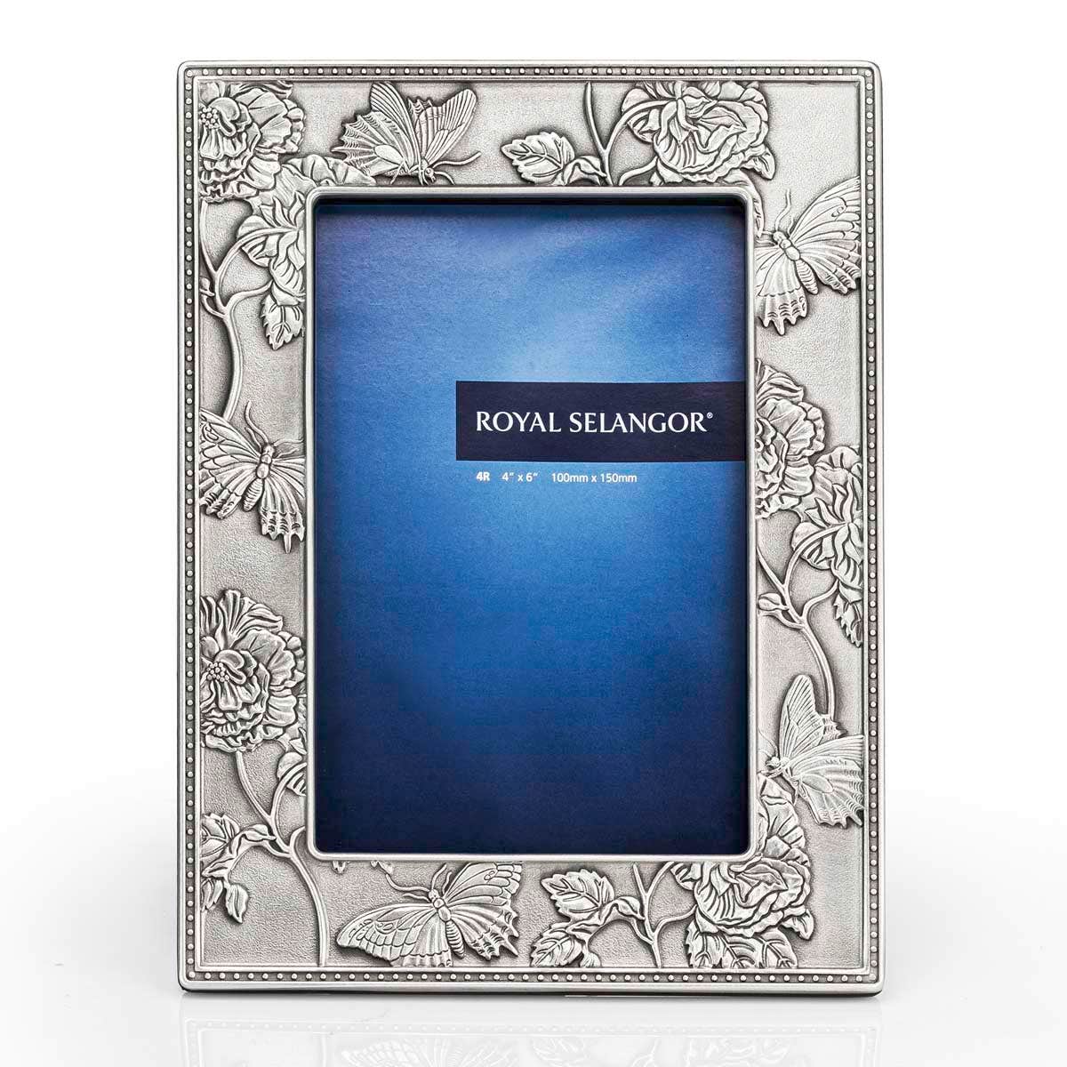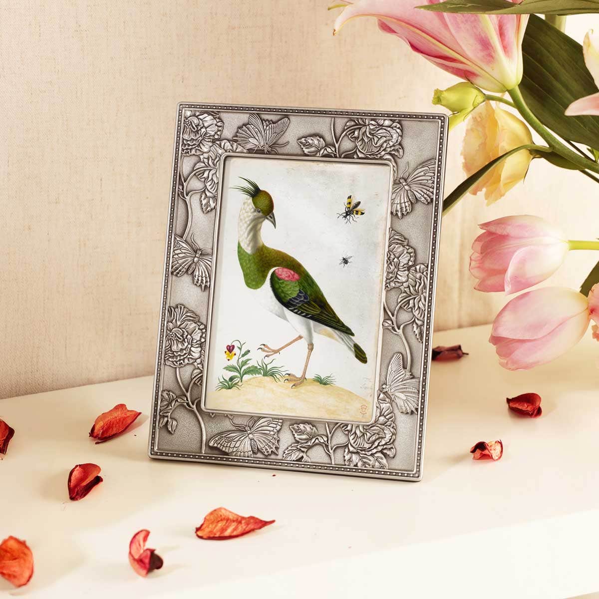 A graceful addition to your home, the Merian Photo Frame features the cotton rose in bloom and two intricately detailed queen swallowtail butterflies (Papilio androgeus).