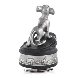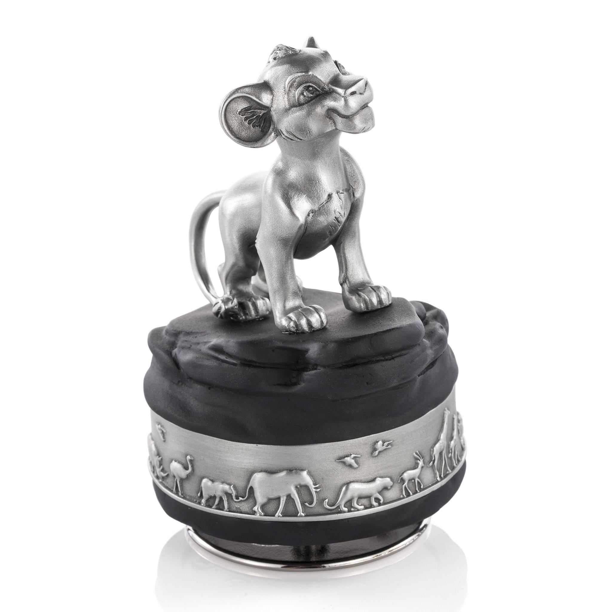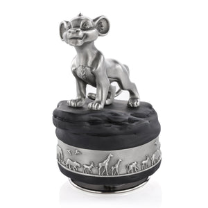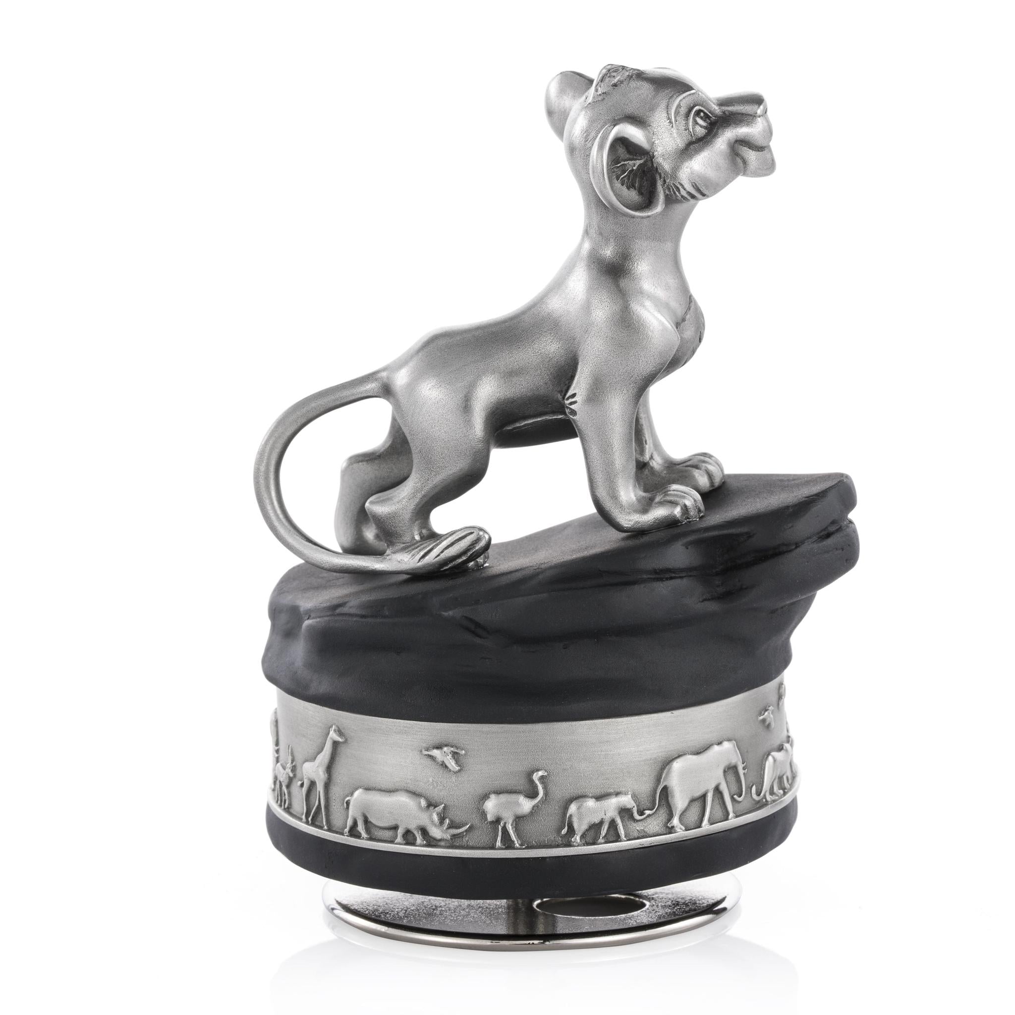 In a classic coming-of-age story, Simba dreams of the day when it comes time for him to rule the vast Pride Lands. The eager lion cub finds his courage tested and his faith shaken but, buoyed by the strength of his friendships, as well as his sense of belonging, he triumphs on his journey in the Circle Of Life. In pewter, on a plinth of bonded porcelain.