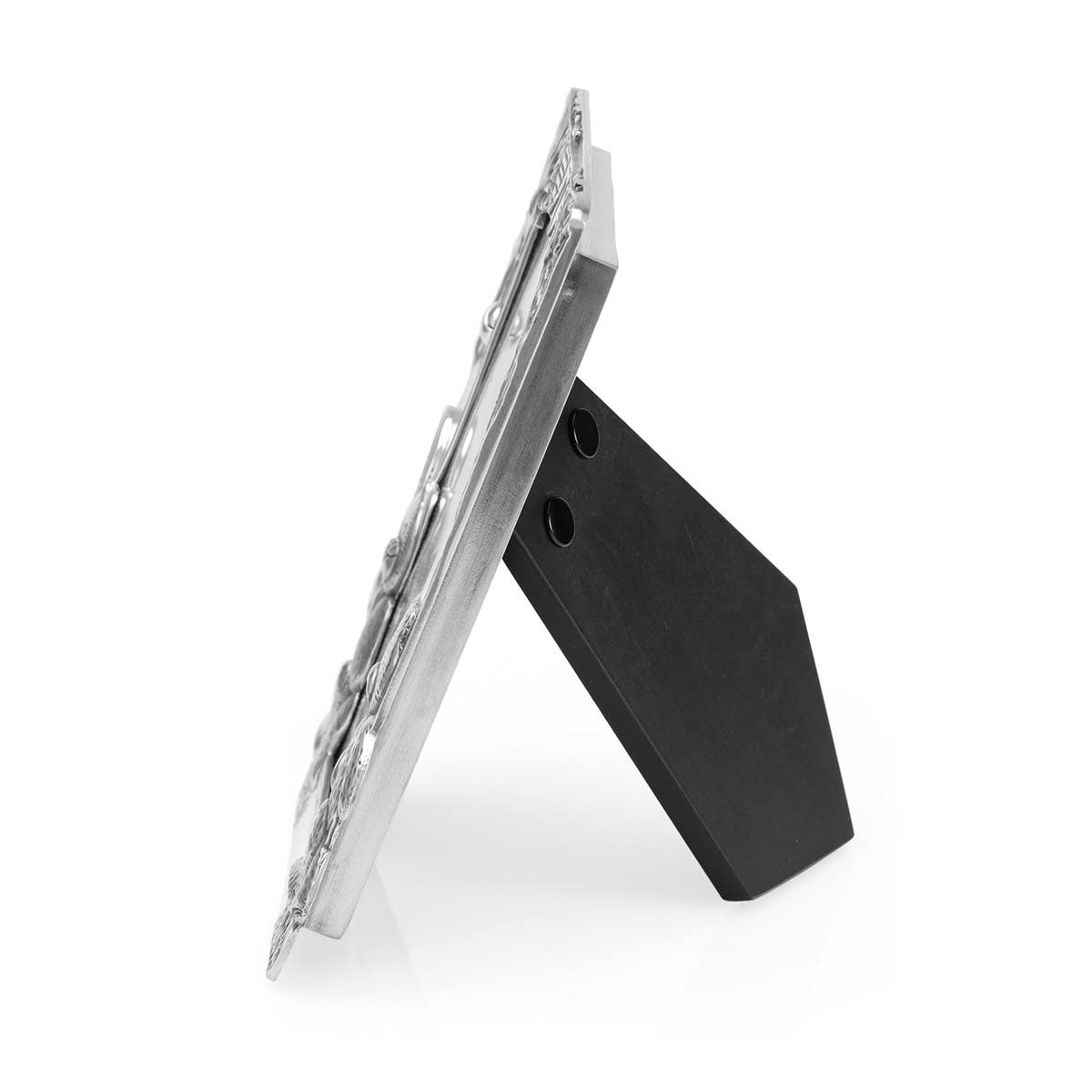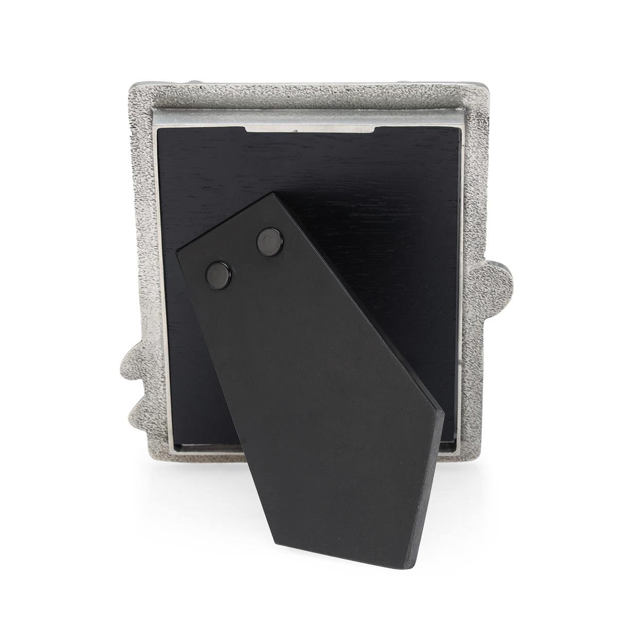 Pewter frame on a wood backing.