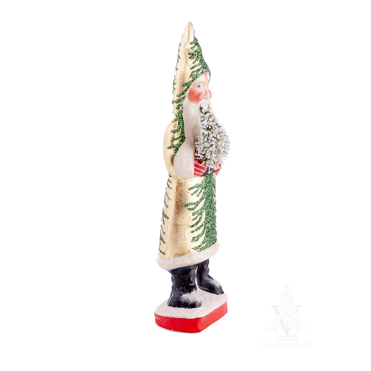 - With a shimmering gold leafed coat, this Santa is embellished with a hand-painted tree on both his front and back. Medium in height, the detail found within the tree is drastic and is complimented with a hand decorated bottle brush tree in his hand.