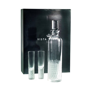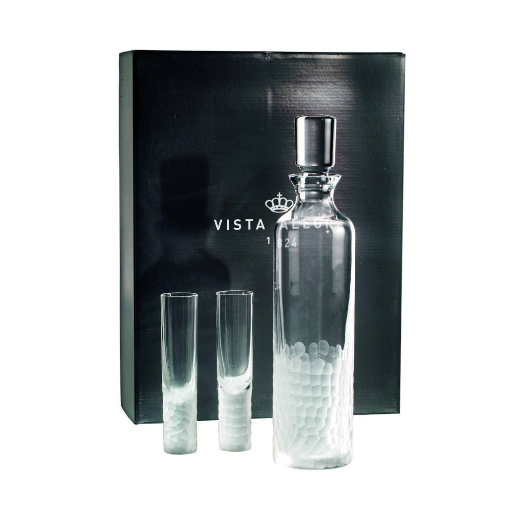 A set for vodka, where the simplicity of the forms highlights the stoning handiwork, with a satin finish on the lower part of the pieces. A decoration that stands out for its purity and transparency, reminding us of the drink that it is intended for. A set for vodka, where the simplicity of the forms highlights the stoning handiwork, with a satin finish on the lower part of the pieces. A decoration that stands out for its purity and transparency, reminding us of the drink that it is intended for.