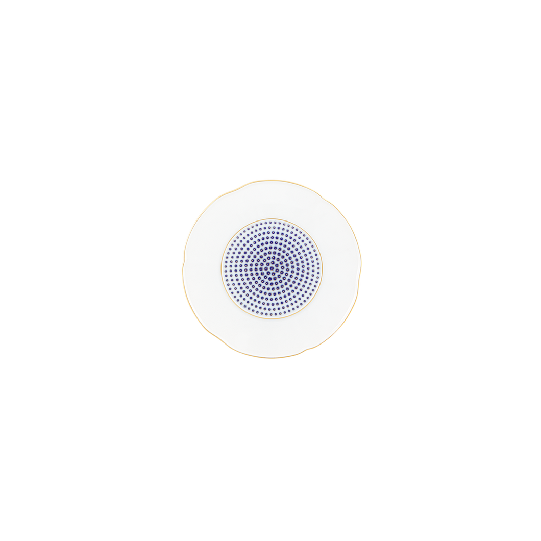 A set based on the pattern known as œil-deperdrix (partridge eye), originating in the late 18th century and very common in Sèvres porcelain. In shades of fiery blue and gold, using modern geometric patterns but maintaining the same decorative technique that defines the several textures, this set reinvents techniques used in classical decoration.